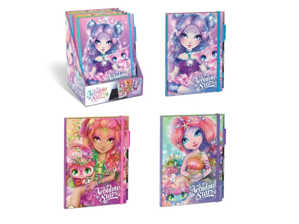 Nebulous Stars Deníček s černými stránkami. Rozměry 20,1 x 15,2 cm, 112 černých stránek. Balení obsahuje deníček a gelové pero. Display box - 6 ks. 3 varianty - zelená, fialová, modrá.
