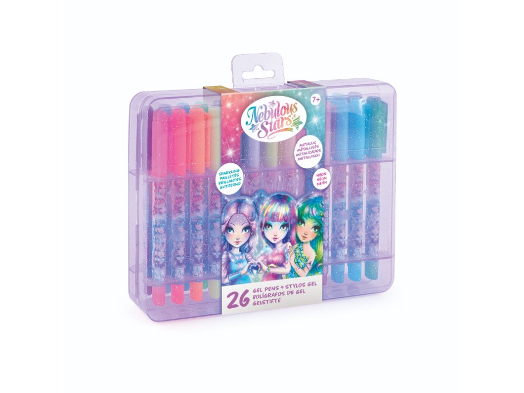 Nebulous Stars Gelová pera set. Plastový kufřík, který obsahuje 26 gelových per. Třpytivé neonové barvy. 9 per s třpytivým gelem, 8 metalických per, 8 neonových per, 1 černé gelové pero. Display box - 6 ks.