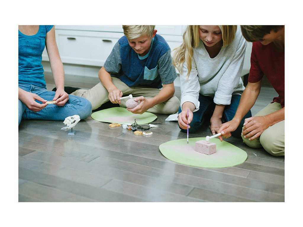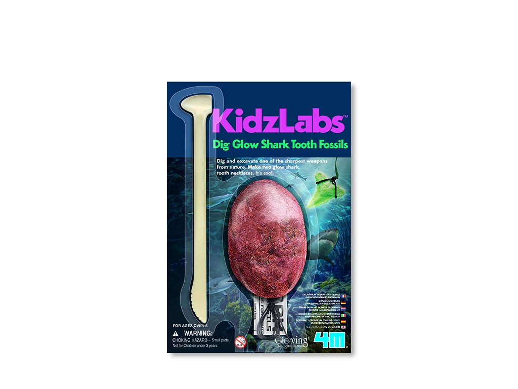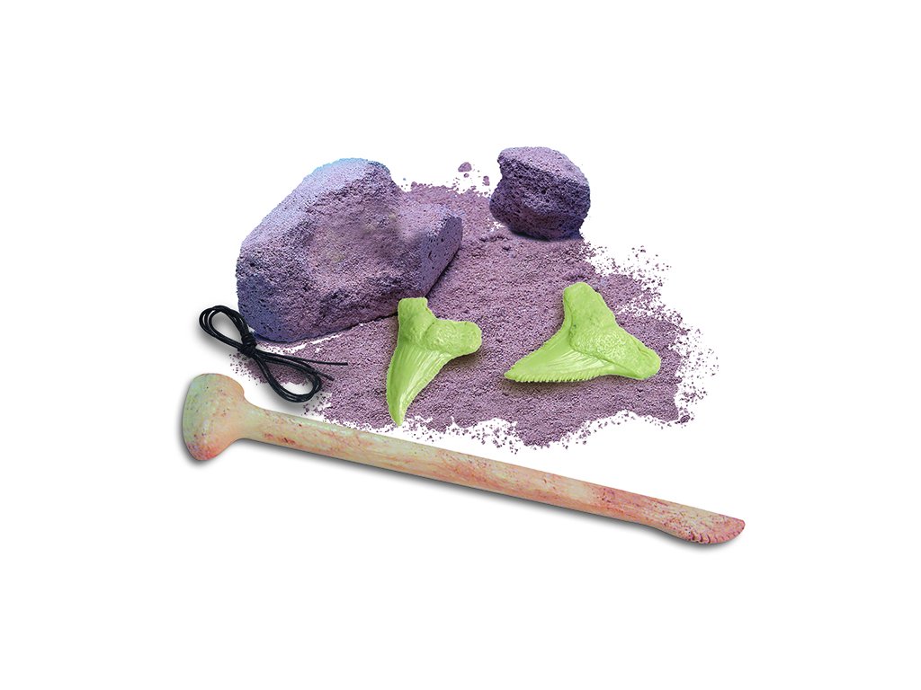 Obsahuje 2 žraločí zuby svítící ve tmě zalité do sádrového bloku, speciální nástroj, provázek a instrukce.