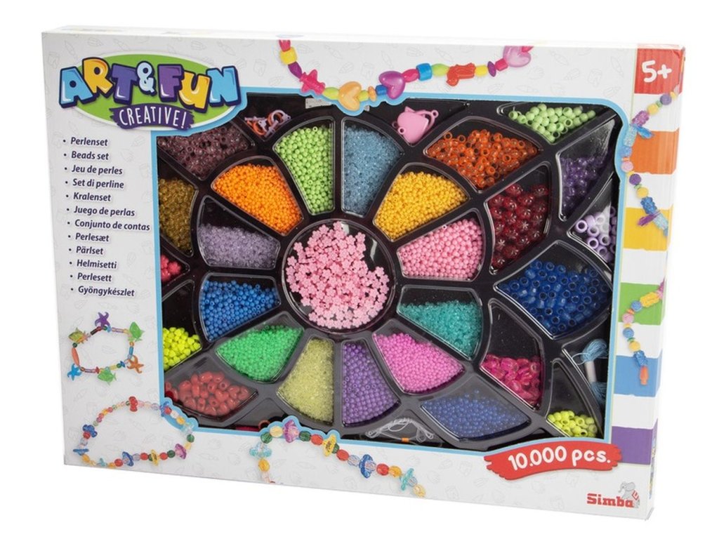 Sada korálků různých tvarů a barev v dárkovém balení. Navlékací šňůrka i spojky součástí. Obsahuje 10 000 korálků.