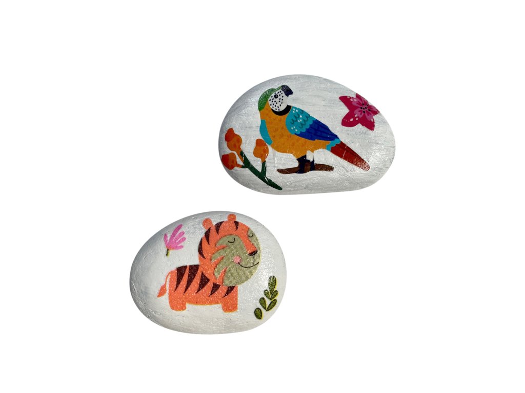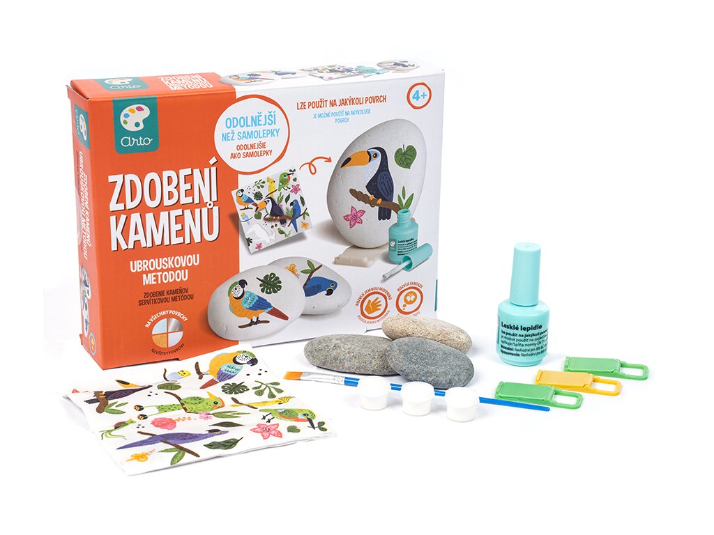 Ozdob si kámen. Sada obsahuje vše pro přípravu dekoračních doplňků - pomocí specielního lepidla si ozdob kamínek dle přiložených motivů. Součástí balení jsou i stojánky.