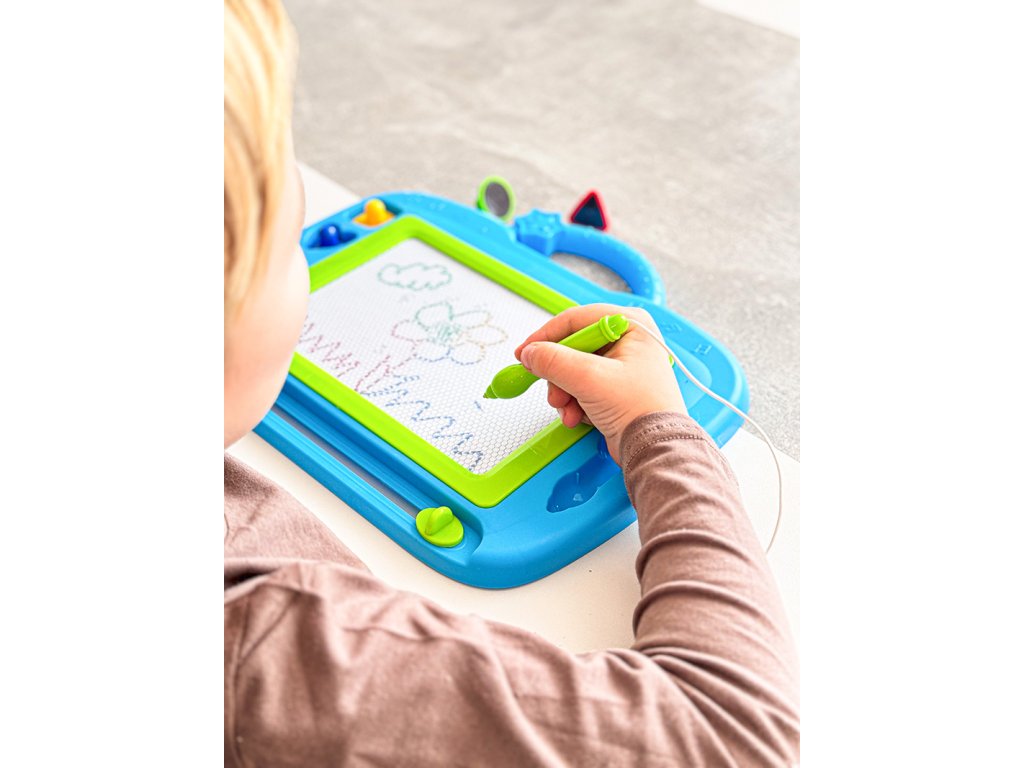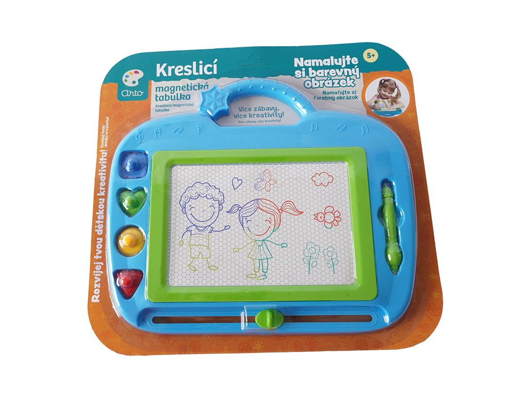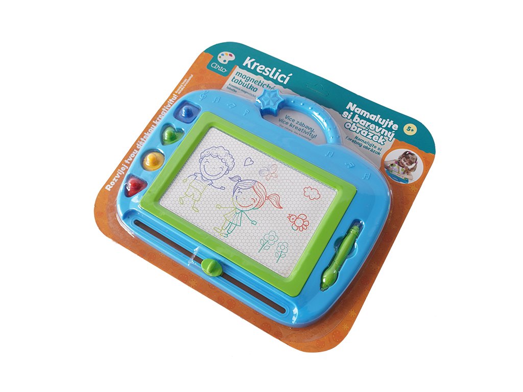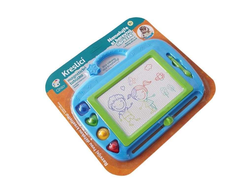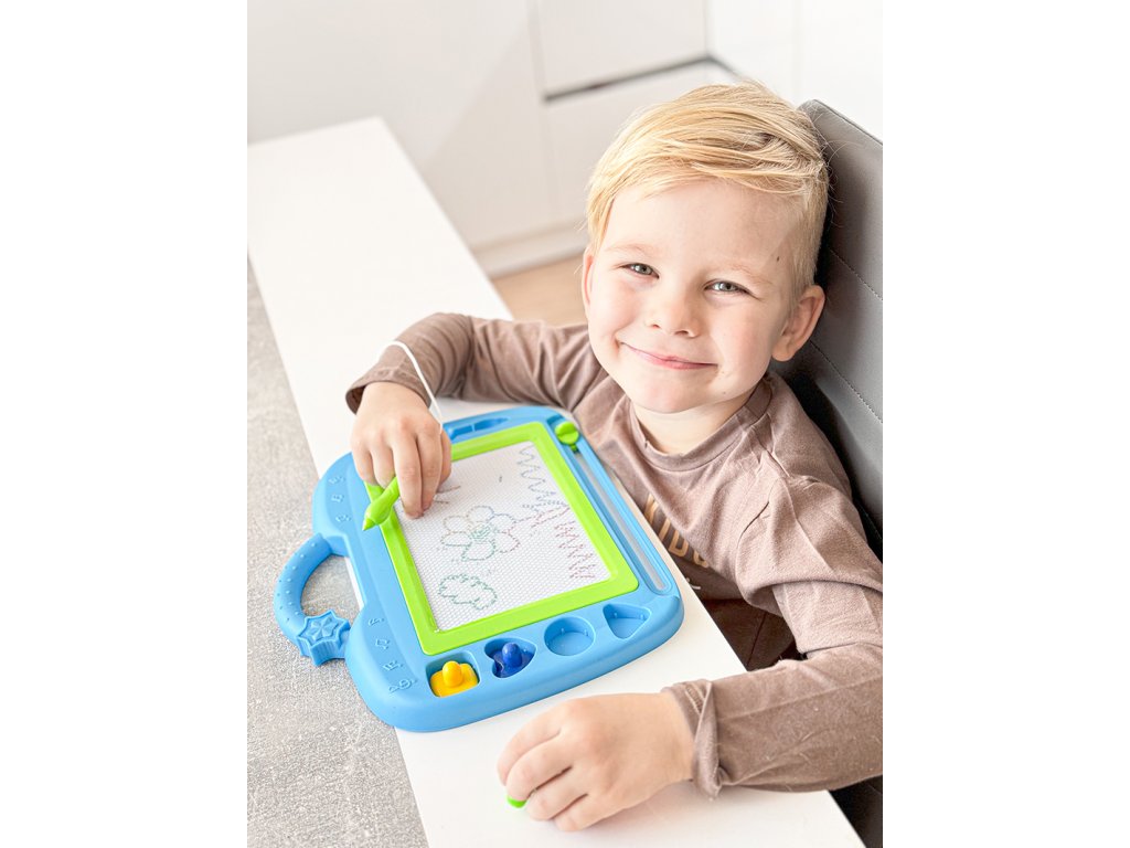 Na magnetickou tabulku kreslíš přiloženým perem. Můžeš použít i přiložená tiskátka. Jedním tahem lze obrázek smazat a můžeš začít znovu malovat.