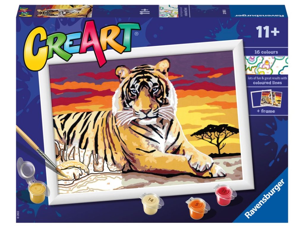 CreArt - to je kreativní zábava doslova pro každého. Staňte se na chvíli profesionálním malířem a namalujte si svůj vlastní obraz. Tento majestátní tygr rozzáří každou zeď. Postupně vybarvujte jednotlivé plochy podle návodu (každé číslo na plátně odpovídá jedné konkrétní barvě) a dopřejte si radost z tvůrčí práce, u které se zabavíte na dlouhé hodiny. Malování je skvělá činnost, která nejen baví, ale také procvičuje zručnost, zlepšuje koncentraci a zaručuje spokojenost a pocit hrdosti všem umělcům. Set obsahuje vše, co potřebujete k malování: vysoce kvalitní, pevné plátno s obrazovou předlohou s očíslovanými plochami, sadu akrylových barev, štětec, kartonový stojánek pro kelímky s barvami a rámeček. Vykreslené plochy vytváří profesionálně vypadající umělecké dílo. Jakmile obraz dokončíte, nechte ho zaschnout a zarámujte ho do rámečku, který je součástí balení. Malování nikdy nebylo tak jednoduché.