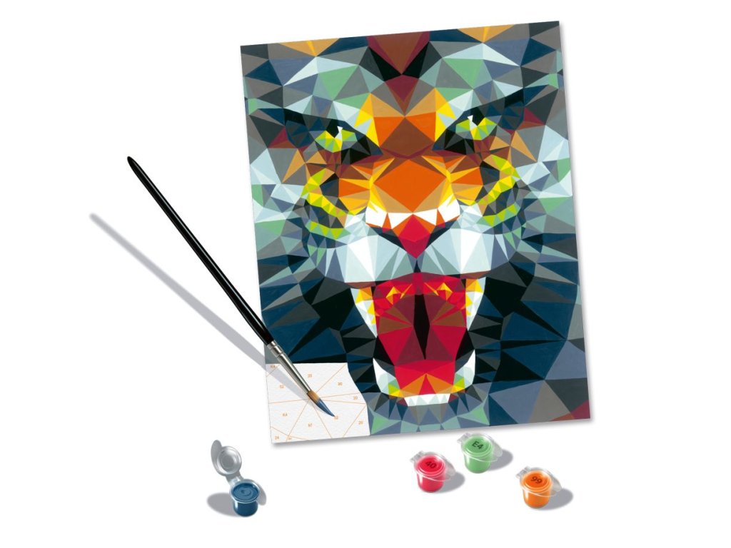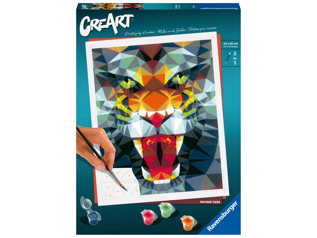 CreArt - to je kreativní zábava doslova pro každého. Staňte se na chvíli profesionálním malířem a namalujte si svůj vlastní obraz. Tento barevný obraz polygonového tygra ozdobí každou zeď. Postupně vybarvujte jednotlivé plochy podle návodu (každé číslo na plátně odpovídá jedné konkrétní barvě) a dopřejte si radost z tvůrčí práce, u které se zabavíte na dlouhé hodiny. Malování je skvělá činnost, která nejen baví, ale také procvičuje zručnost, zlepšuje koncentraci a zaručuje spokojenost a pocit hrdosti všem umělcům. Set obsahuje vše, co potřebujete k malování: vysoce kvalitní, pevný kartonový podklad s obrazovou předlohou s očíslovanými plochami, sadu akrylových barev, štětec, kartonový stojánek pro kelímky s barvami. Vykreslené plochy vytváří profesionálně vypadající umělecké dílo. Jakmile obraz dokončíte, nechte ho důkladně zaschnout. Malování nikdy nebylo tak jednoduché.