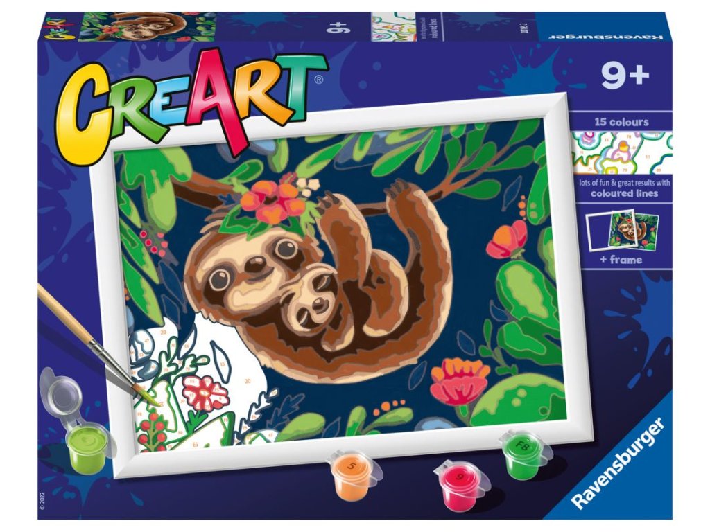 CreArt - to je kreativní zábava doslova pro každého. Staňte se na chvíli profesionálním malířem a namalujte si svůj vlastní obraz. Tito roztomilí lenochodi rozzáří každou zeď. Postupně vybarvujte jednotlivé plochy podle návodu (každé číslo na plátně odpovídá jedné konkrétní barvě) a dopřejte si radost z tvůrčí práce, u které se zabavíte na dlouhé hodiny. Malování je skvělá činnost, která nejen baví, ale také procvičuje zručnost, zlepšuje koncentraci a zaručuje spokojenost a pocit hrdosti všem umělcům. Set obsahuje vše, co potřebujete k malování: vysoce kvalitní, pevné plátno s obrazovou předlohou s očíslovanými plochami, sadu akrylových barev, štětec, kartonový stojánek pro kelímky s barvami a rámeček. Vykreslené plochy vytváří profesionálně vypadající umělecké dílo. Jakmile obraz dokončíte, nechte ho zaschnout a zarámujte ho do rámečku, který je součástí balení. Malování nikdy nebylo tak jednoduché.