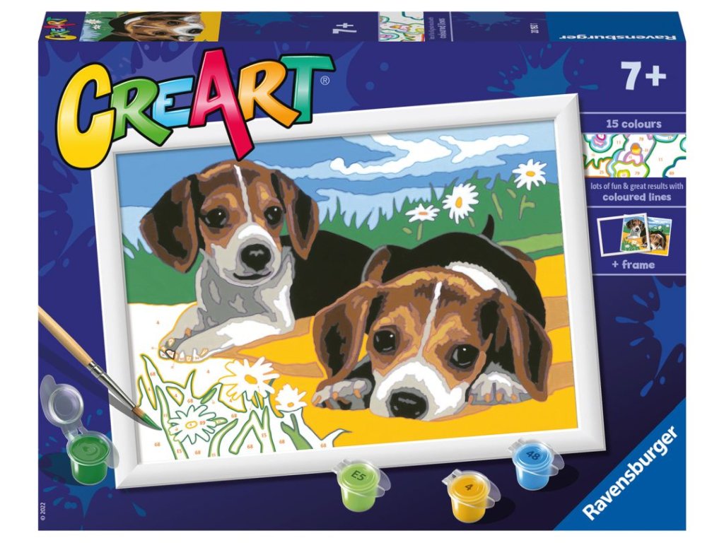 CreArt - to je kreativní zábava doslova pro každého. Staňte se na chvíli profesionálním malířem a namalujte si svůj vlastní obraz. Tato krásná štěňátka Jask Russella rozzáří každou zeď. Postupně vybarvujte jednotlivé plochy podle návodu (každé číslo na plátně odpovídá jedné konkrétní barvě) a dopřejte si radost z tvůrčí práce, u které se zabavíte na dlouhé hodiny. Malování je skvělá činnost, která nejen baví, ale také procvičuje zručnost, zlepšuje koncentraci a zaručuje spokojenost a pocit hrdosti všem umělcům. Set obsahuje vše, co potřebujete k malování: vysoce kvalitní, pevné plátno s obrazovou předlohou s očíslovanými plochami, sadu akrylových barev, štětec, kartonový stojánek pro kelímky s barvami a rámeček. Vykreslené plochy vytváří profesionálně vypadající umělecké dílo. Jakmile obraz dokončíte, nechte ho zaschnout a zarámujte ho do rámečku, který je součástí balení. Malování nikdy nebylo tak jednoduché.