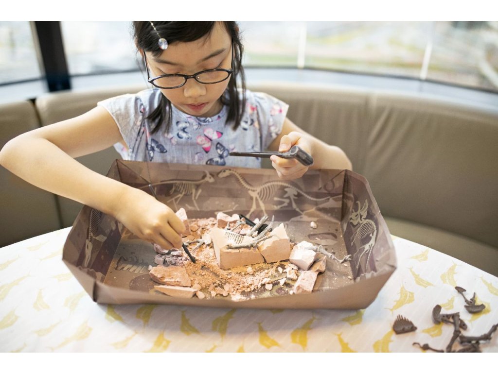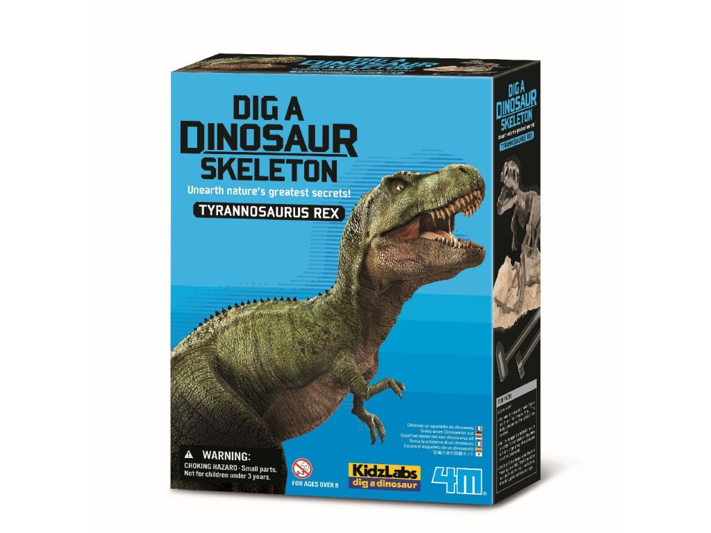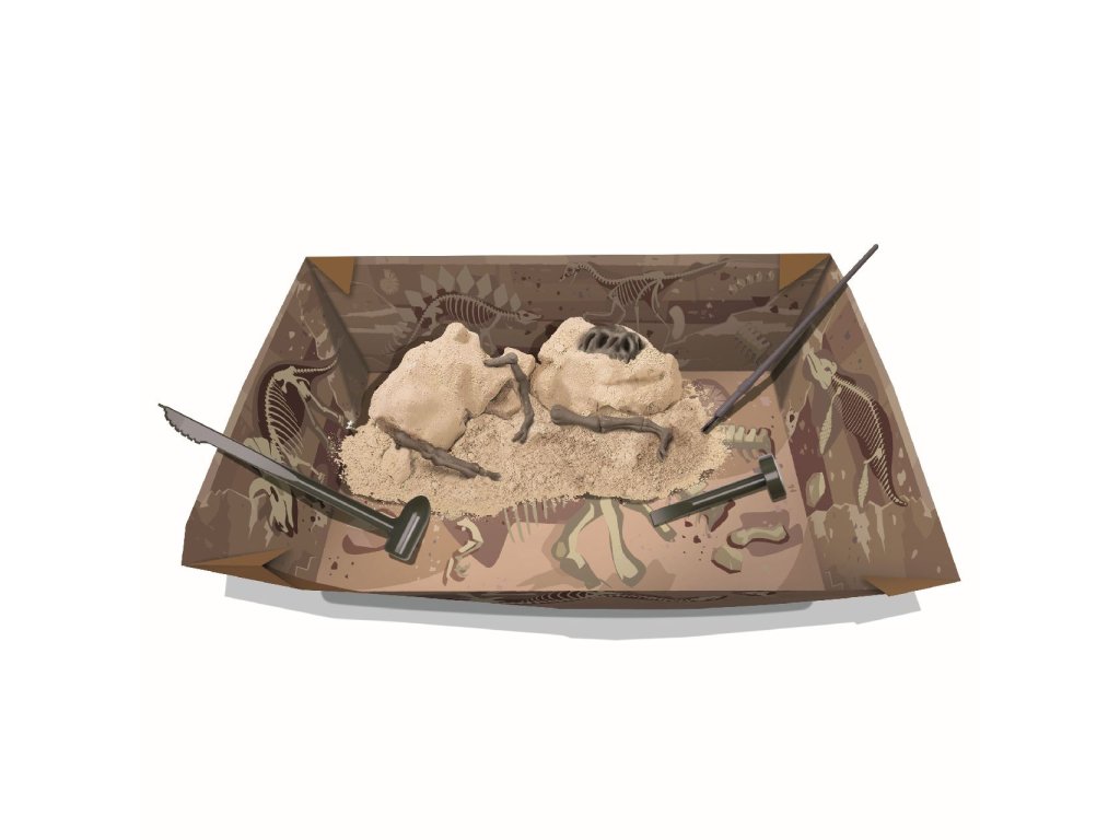 Set pro vykopání a sestavení kostry dinosaura zalité do sádry. Obsahuje potřebné nástroje.