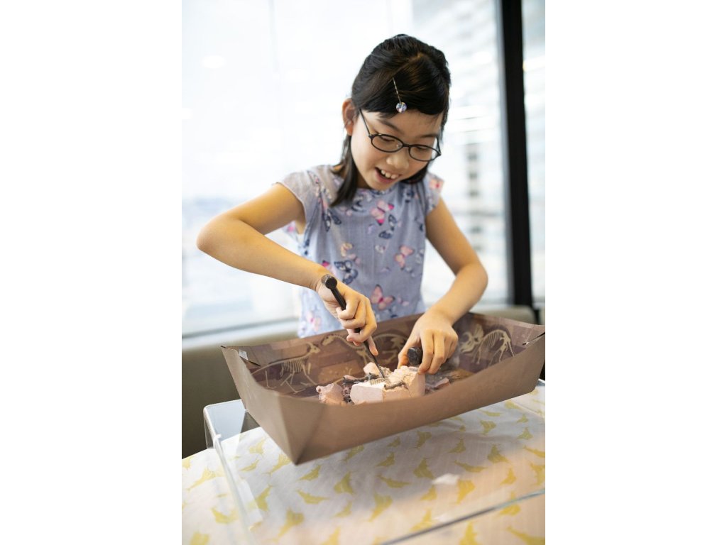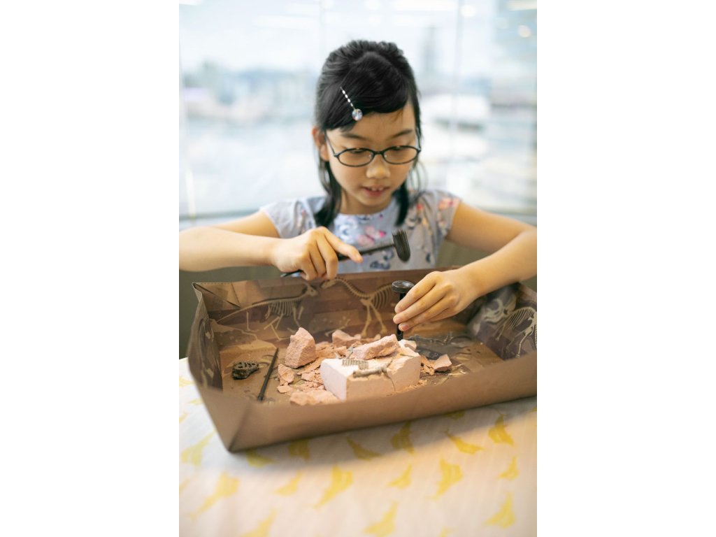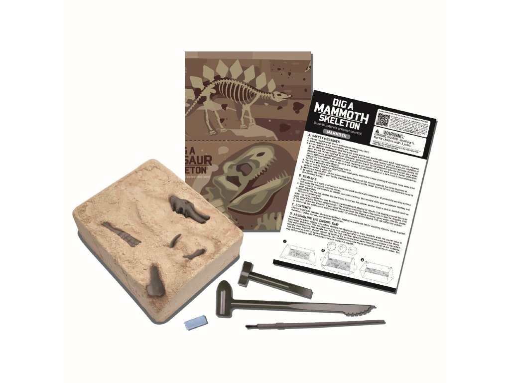 Set pro vykopání a sestavení kostry dinosaura zalité do sádry. Obsahuje potřebné nástroje.