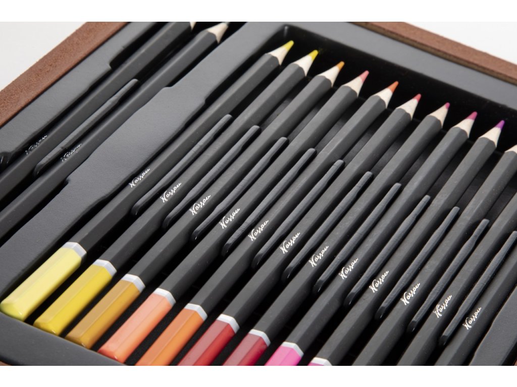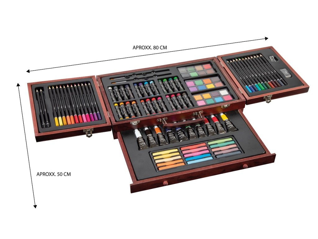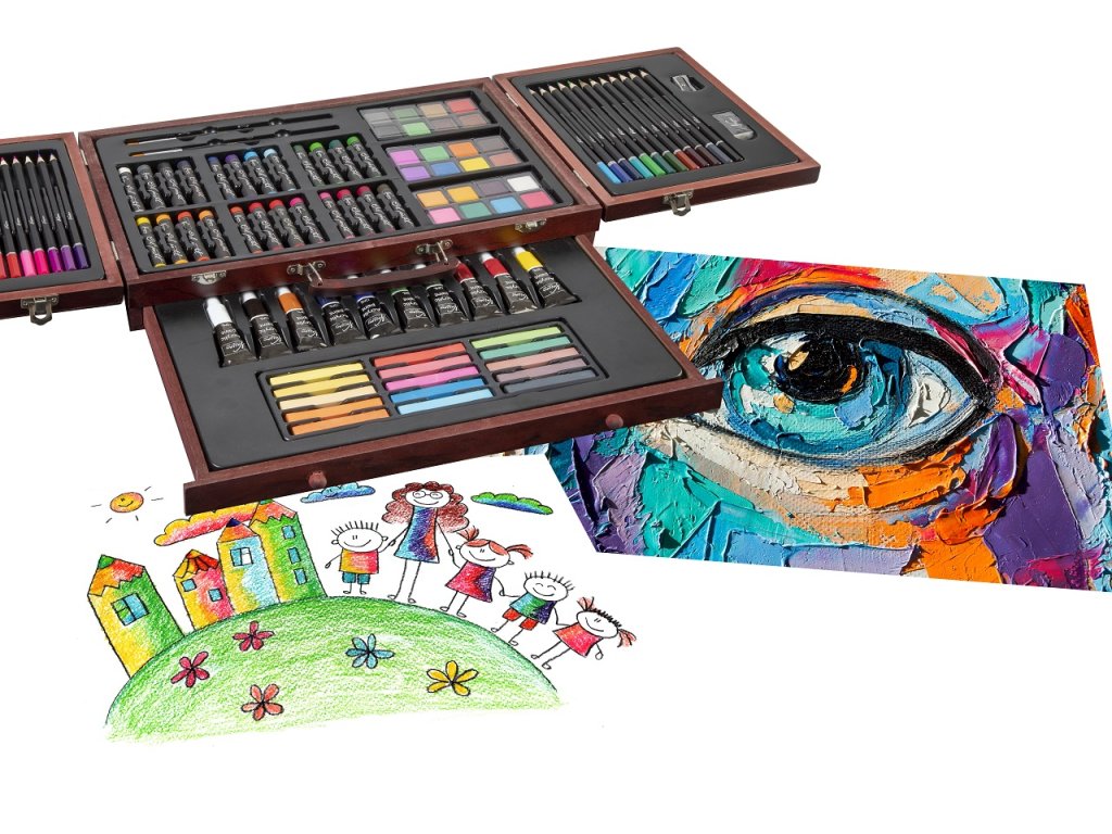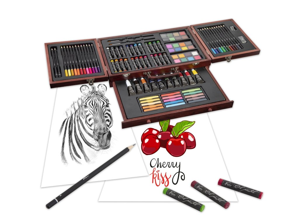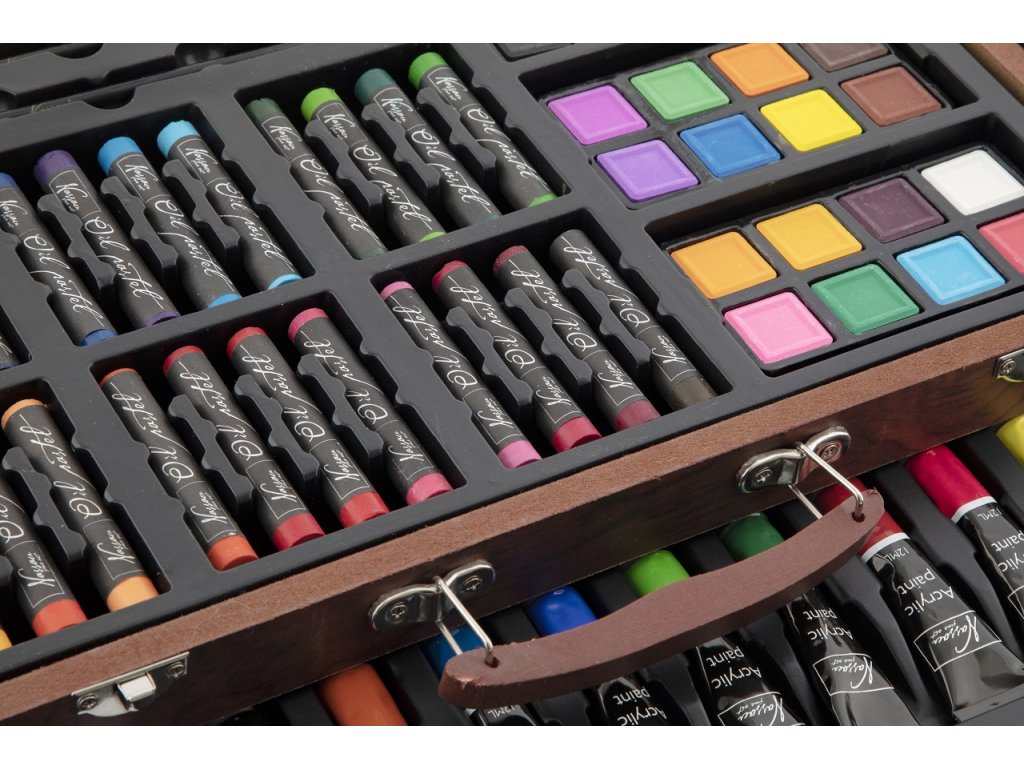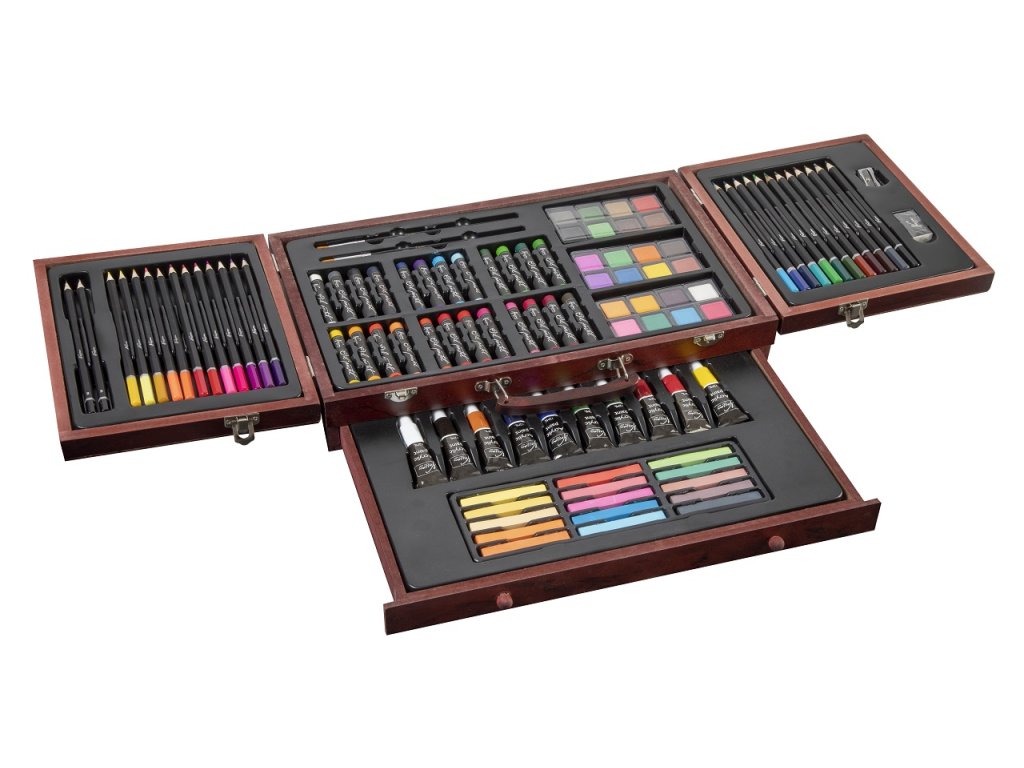 Velká sada na kreslení a malování. Pastelky, vodovky…. Vše uloženo v dřevěném kufříku.