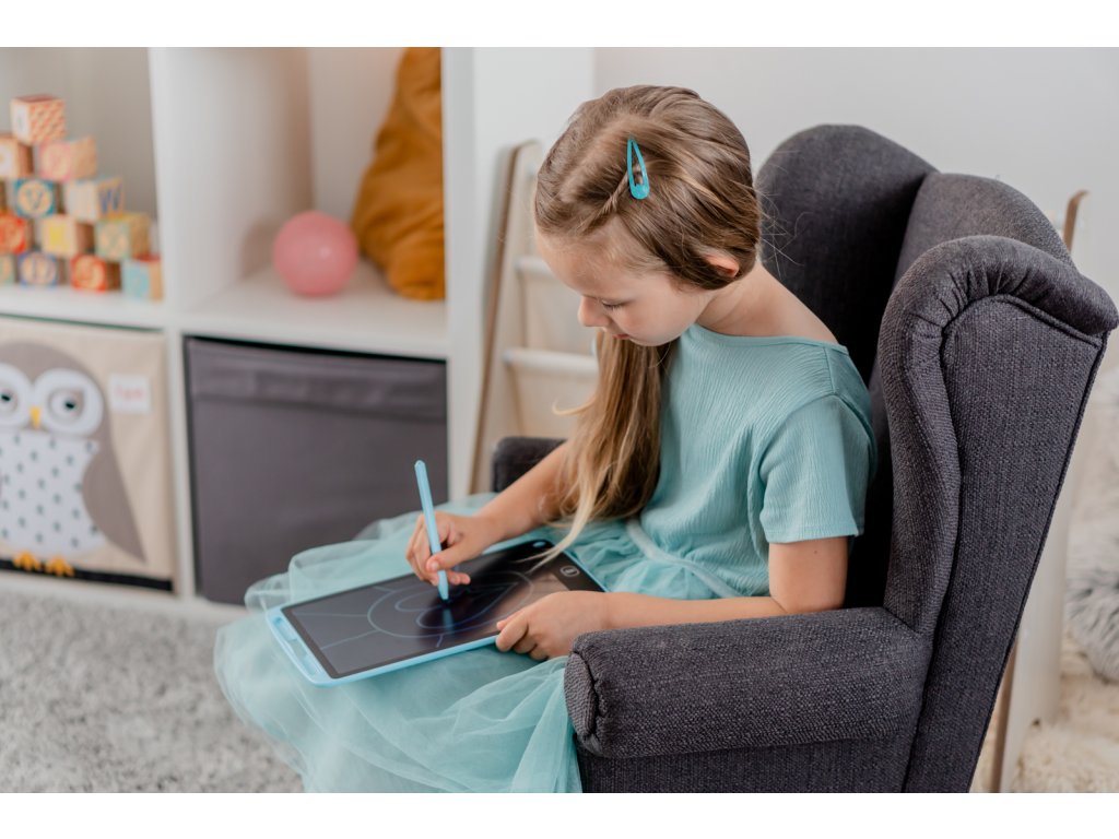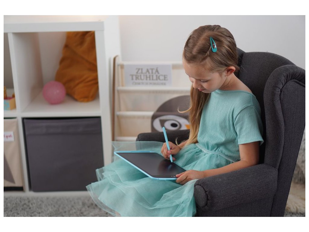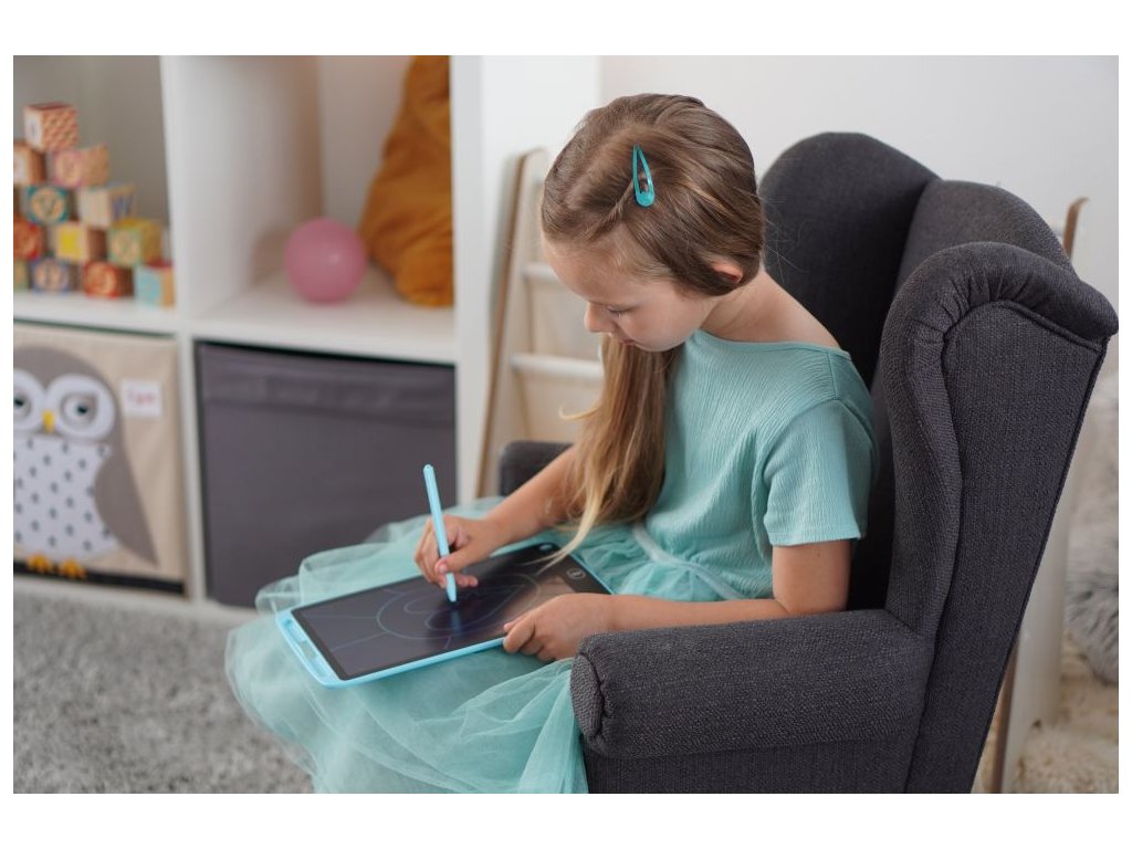 Kreslící tabulka - tablet. Přiloženou tužkou nakresli obrázek na tabulku a zmáčknutím jednoho tlačítka ho smaž. Tabulka je ve tvaru úzkého tabletu. Je moderní a designová. Má barevný podklad - nakreslené obrázky jsou na ní barevné. Velikost 10,5 palce.