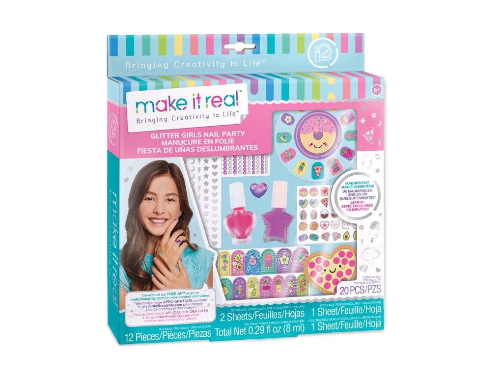 Laky na nehty se zdobením. Obsahuje: 2 barvy laku na nehty, spousta nálepek a ozdob na nehty, instrukce.