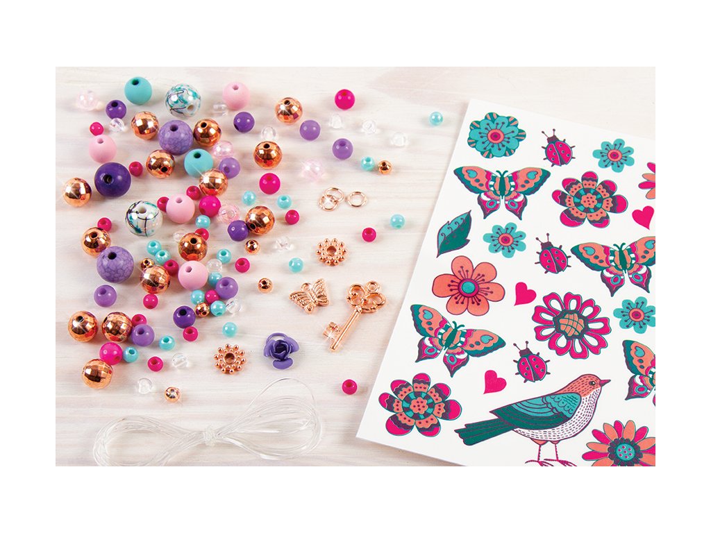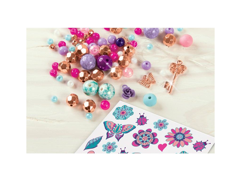 Výroba náramků s motivem květiny. Součástí je i tetování taktéž s motivy květin. Korálky se navlékají na vlasec, který je součástí. Součástí je i mnoho barevných korálků i doplňků. Baleno v krabici. Doporučený věk 8+