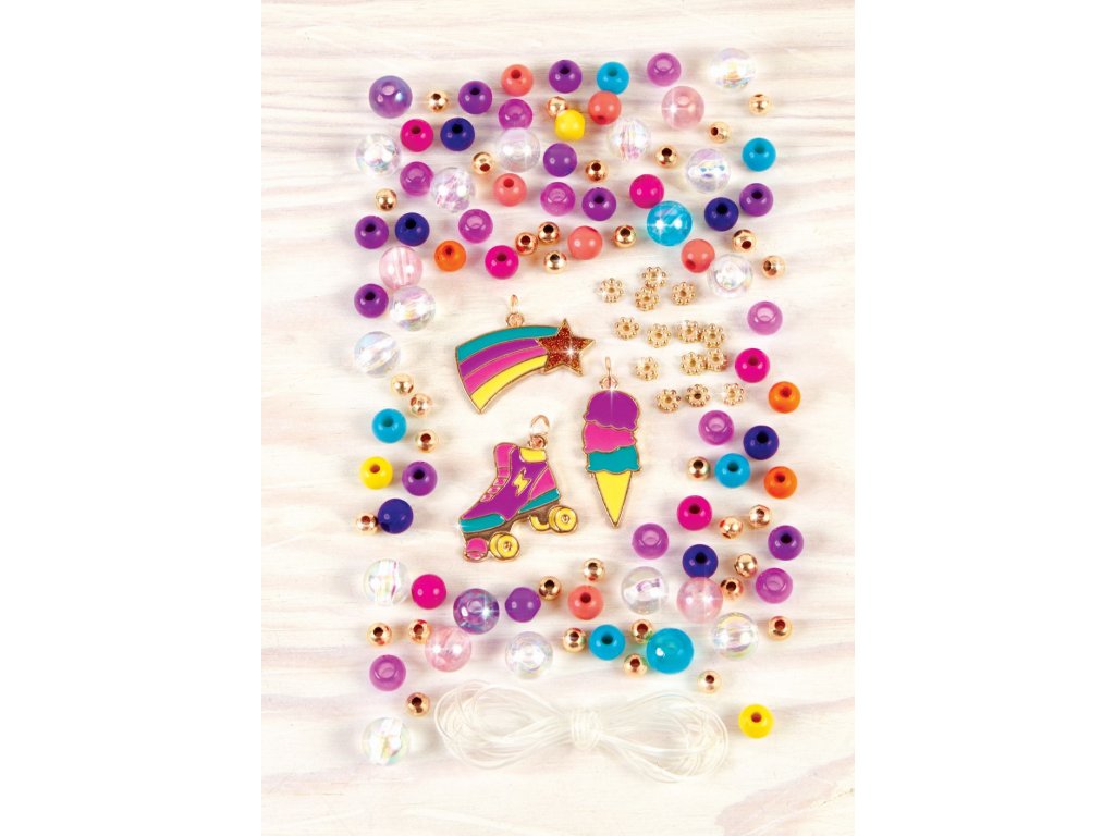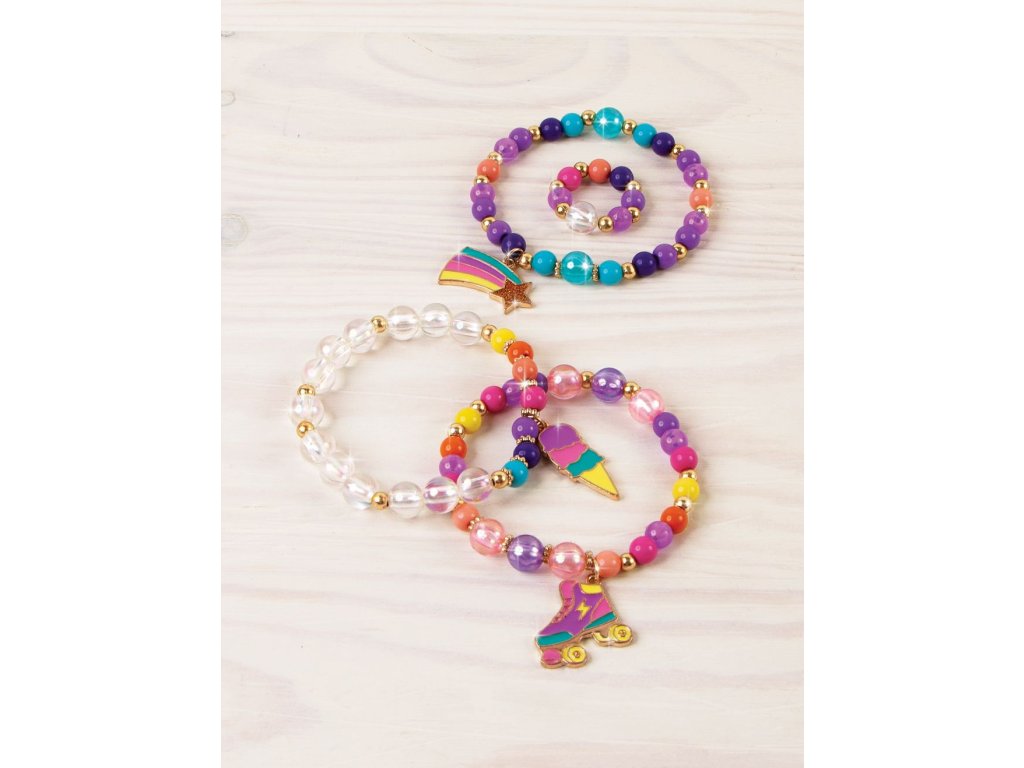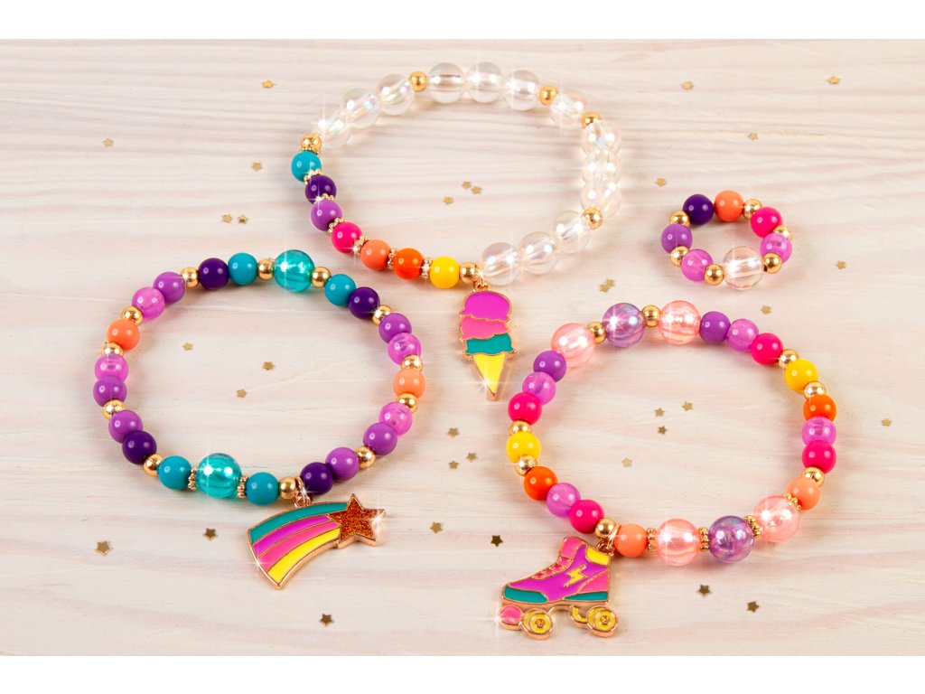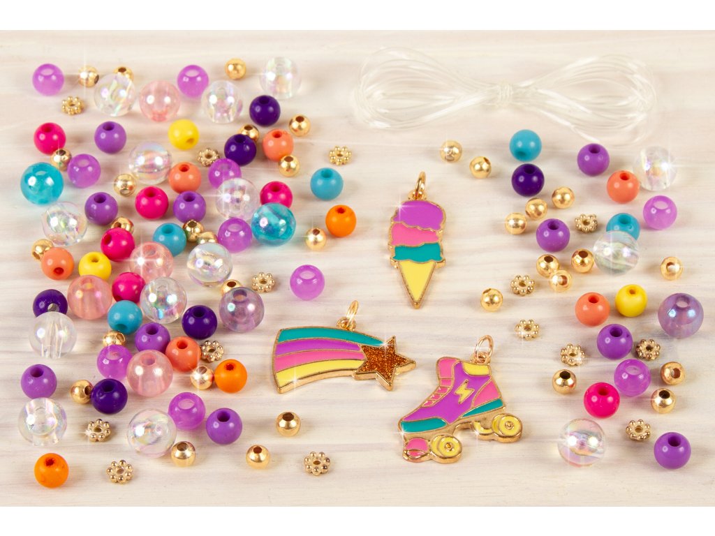 Náramky s přívěsky. Obsahuje: 70 perel, 42 zlatých perel, 3 přívěsky, průsvitnou šňůru dlouhou 1m, instrukce.
