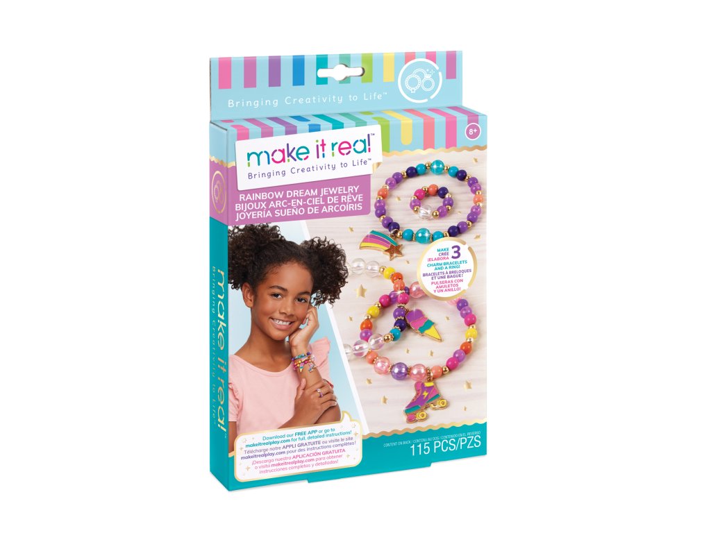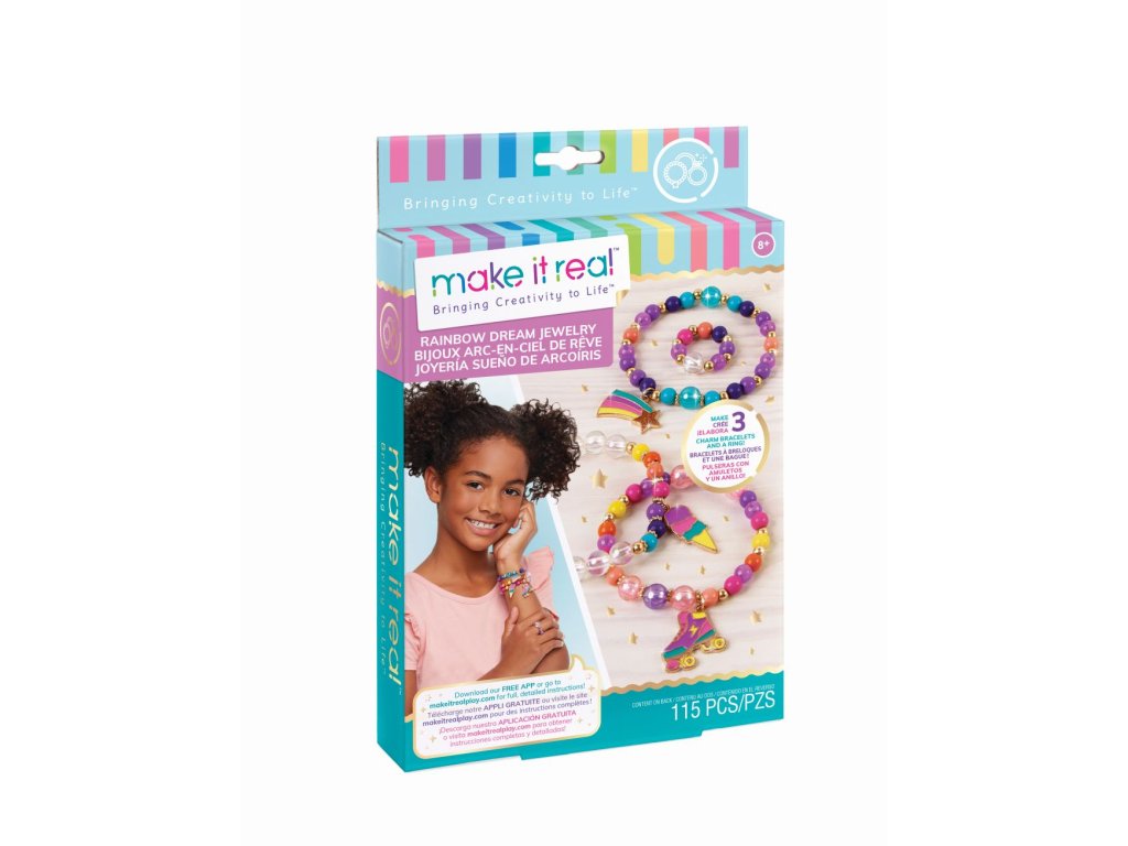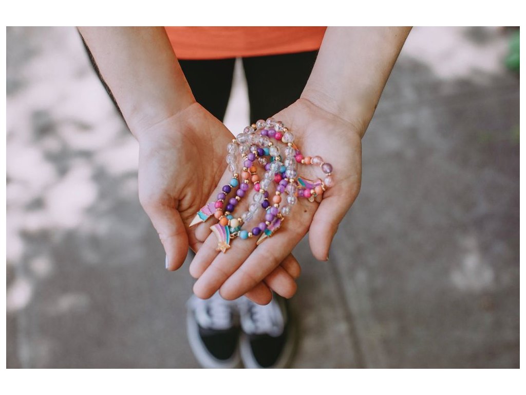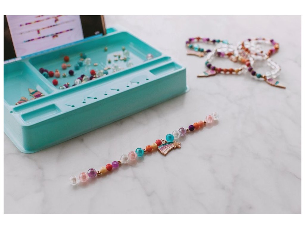 Náramky s přívěsky. Obsahuje: 70 perel, 42 zlatých perel, 3 přívěsky, průsvitnou šňůru dlouhou 1m, instrukce.
