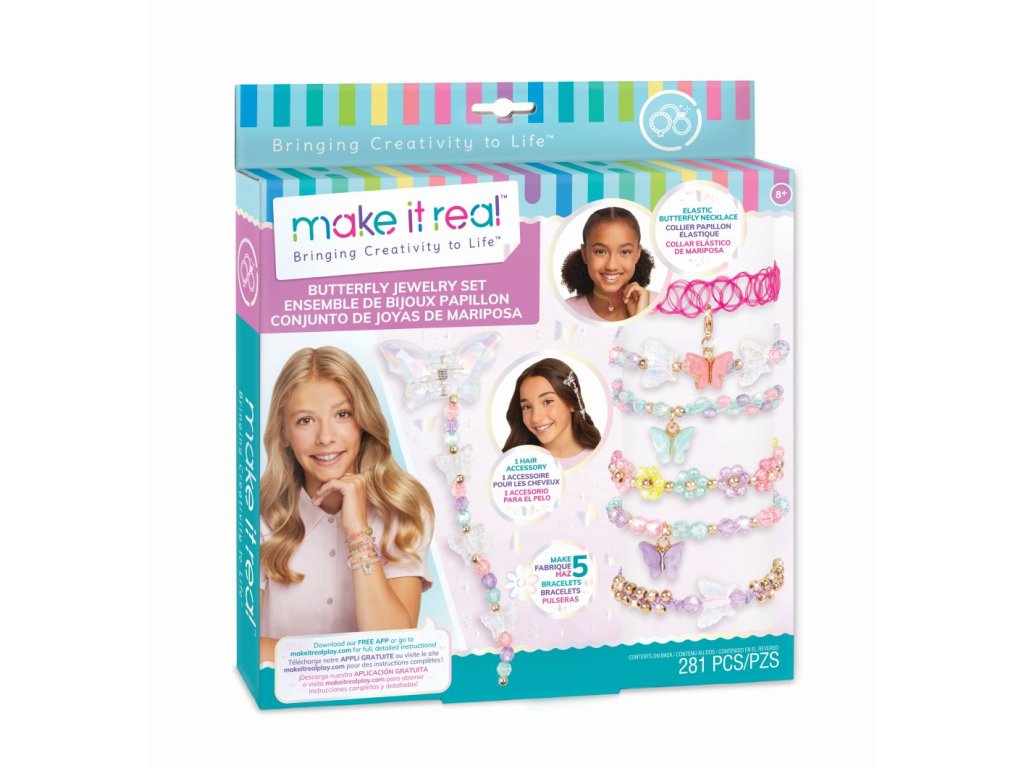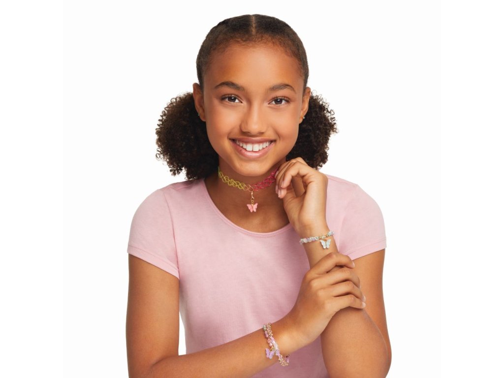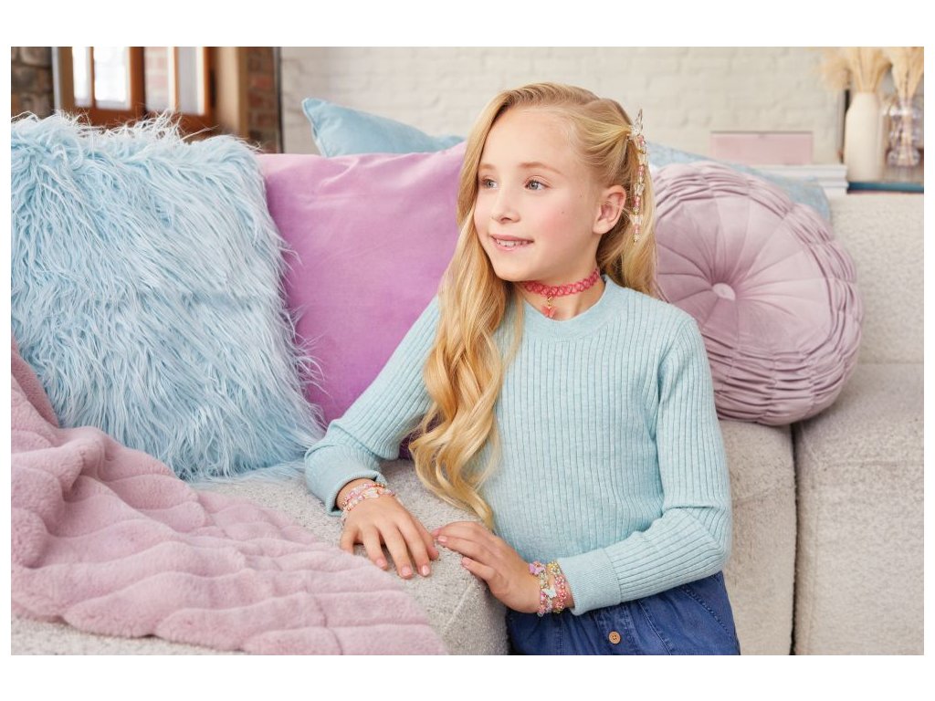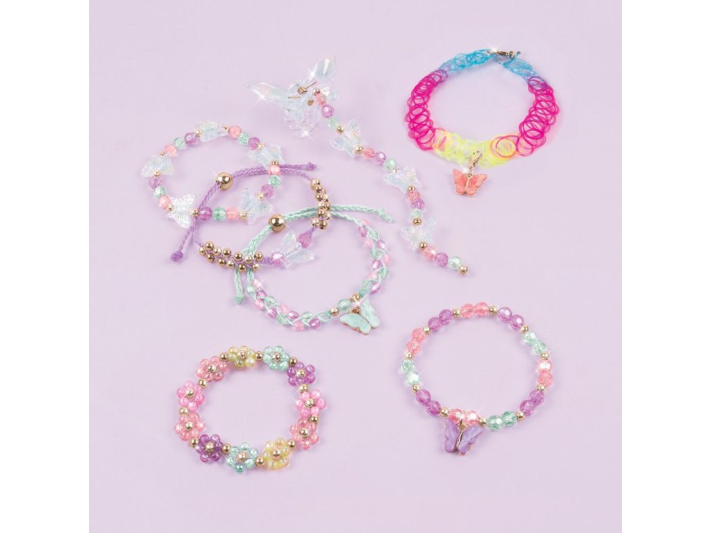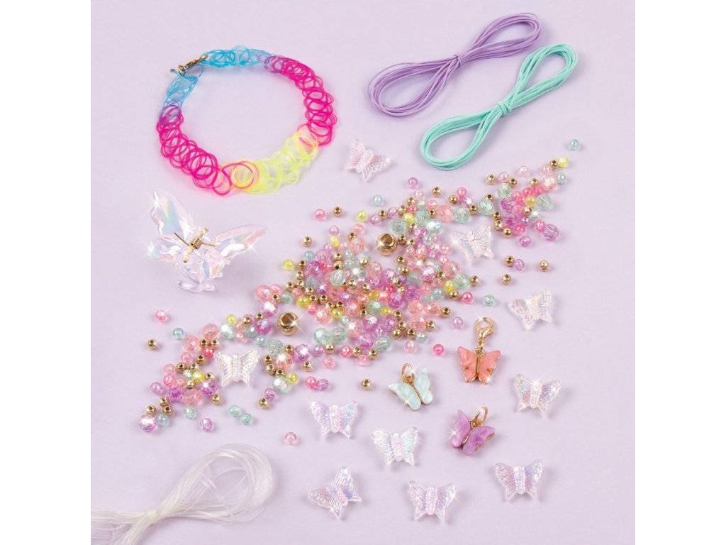 Vyrobte si 3 náramky a 2 náhrdelníky včetně super trendy elastického náhrdelníku ve stylu chocker. Sada obsahuje čirou elastickou šňůrku (4 m), 2 barevné šňůrky (2 m), 271 třpytivých korálků, 3 přívěšky a 1 klip do vlasů ve tvaru motýlka. Baleno v krabici. Vhodné pro děti od 8 let.