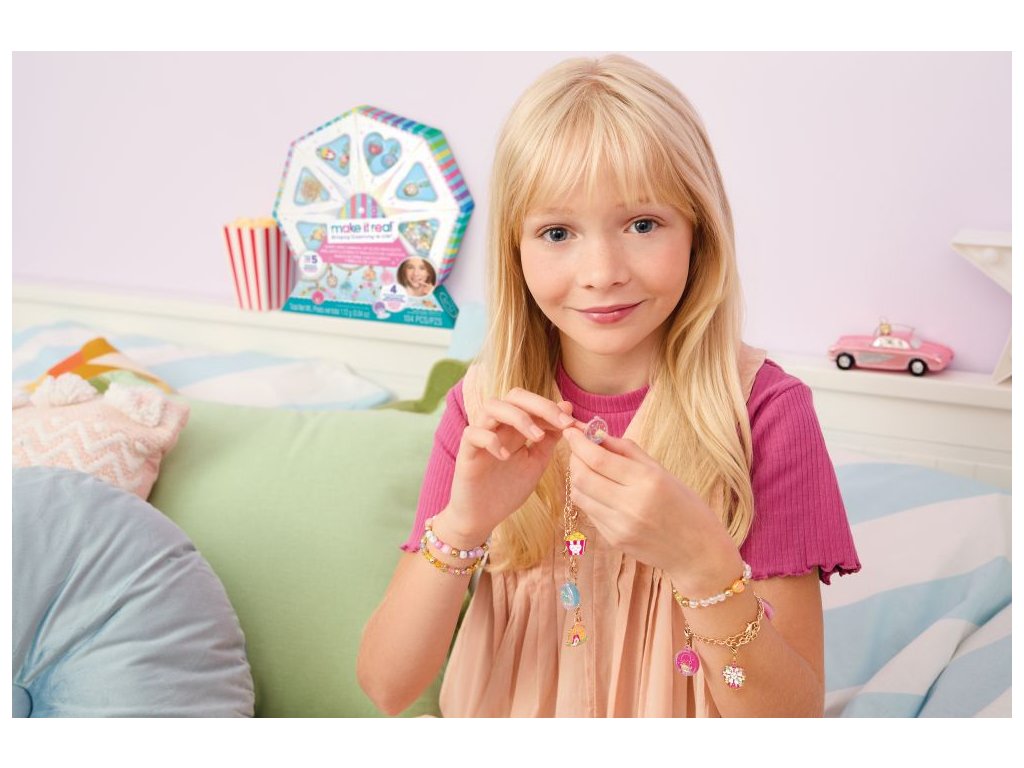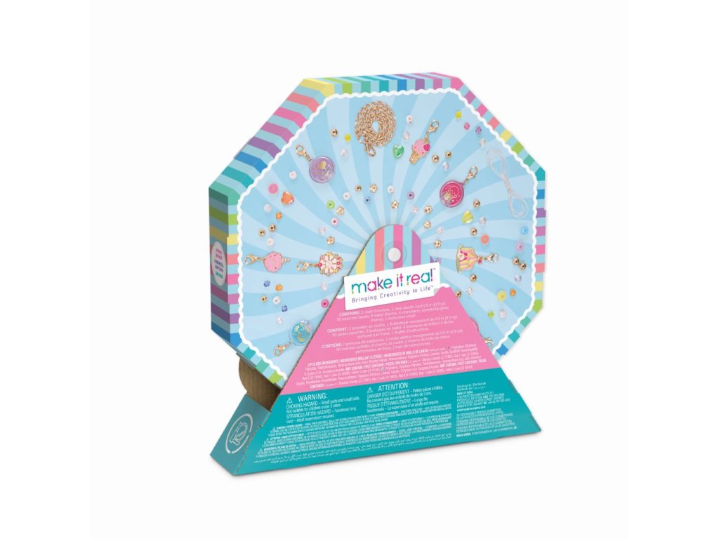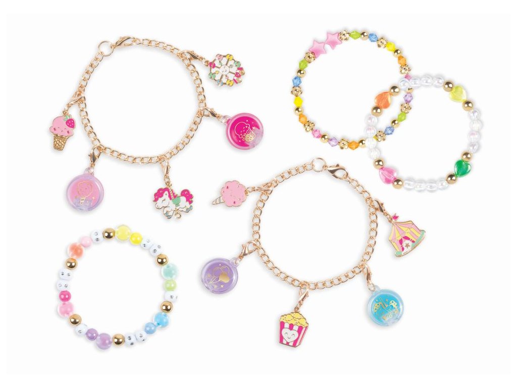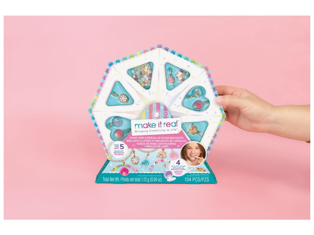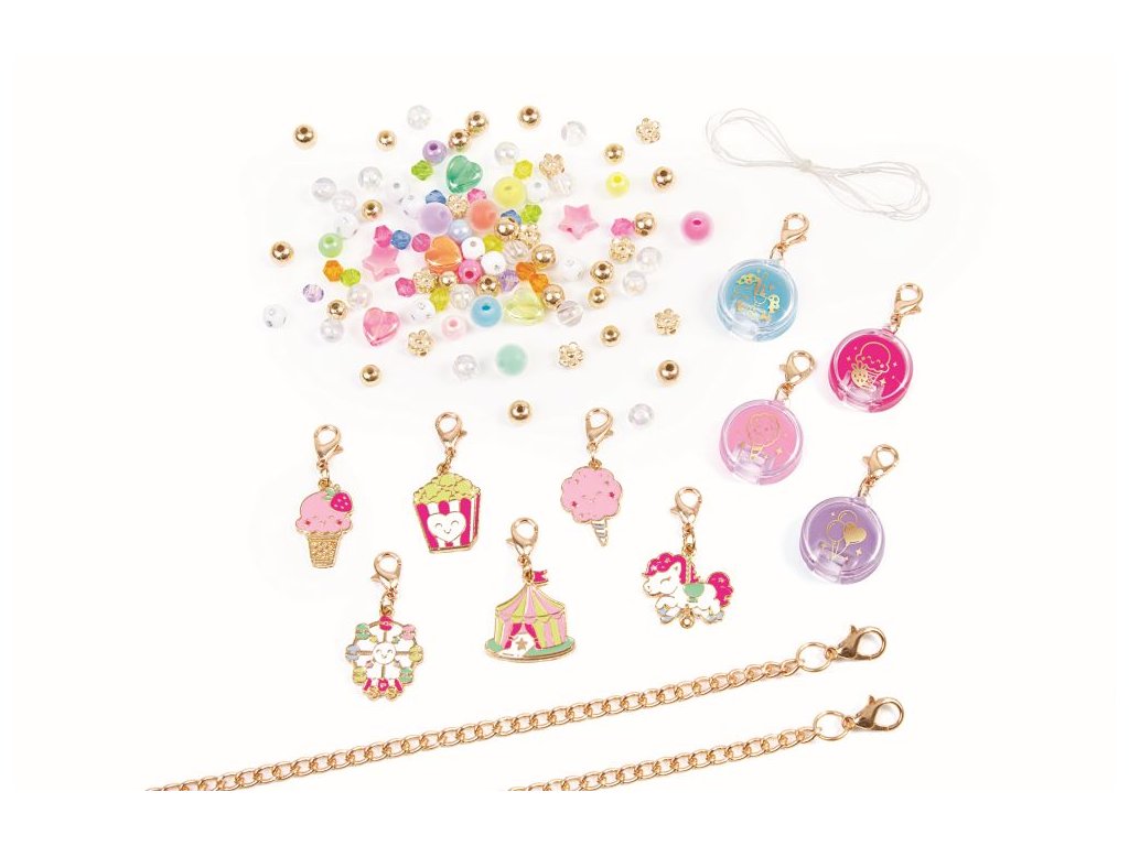 Zkuste své štěstí na veletrhu a vytvořte si pět DIY kouzelných náramků! Každý náramek obsahuje elegantní smaltovaná kouzla, která přinášejí nostalgickou radost ze dne stráveného na karnevalu. Sada obsahuje čtyři vlastní přívěsky s leskem na rty s jahodovou vůní, které ozdobí náramky a dodají šmrnc každému vzhledu make-upu. Obal s motivem ruského kola se dokonce otáčí, díky čemuž je tato sada zábavná jak pro hraní, tak pro tvoření. Tato sada je ideální pro děti, které chtějí svému dennímu outfitu dodat nádech stylu, a je fantastickým dárkem k narozeninám, svátku nebo jen tak. Veškerá kosmetika je testována na bezpečnost pro věk 8+.