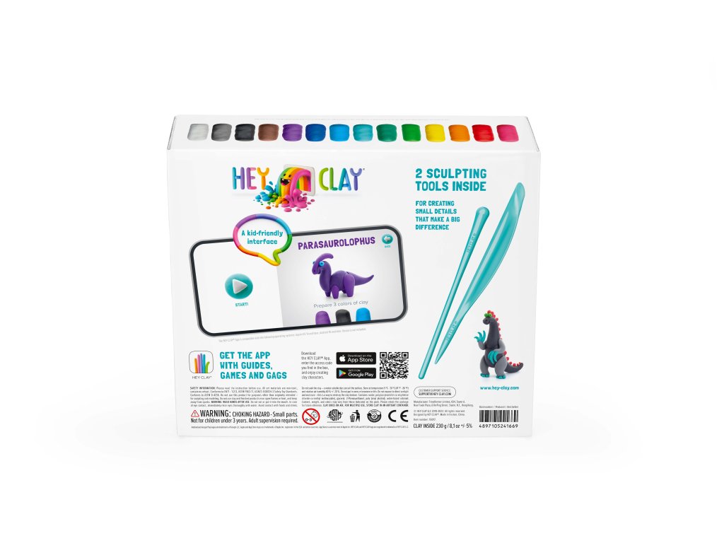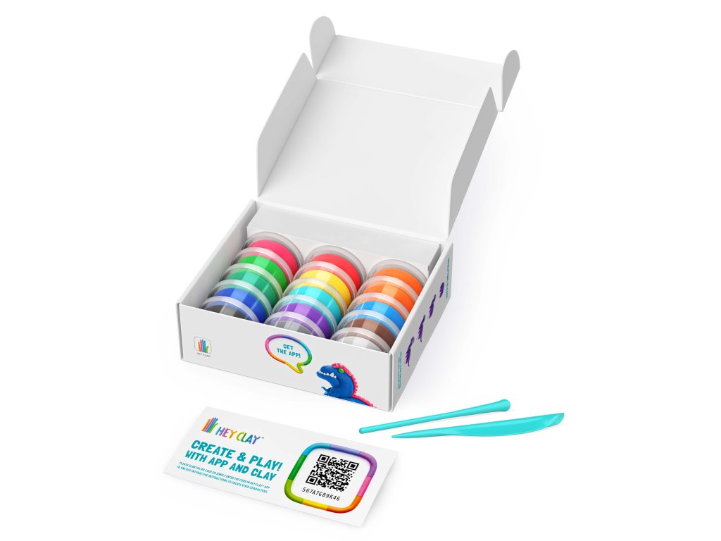 Z modelovací hmoty HEY CLAY si děti mohou vytvořit nepřeberné množství různých postaviček, zvířátek nebo oblíbených hrdinů. Po vymodelování je důležité nechat modely na vzduchu dostatečně zatvrdnout a tím okamžikem se mohou stát součástí dalších her a zábavy. Lze si tak jednoduše vytvořit vlastní figurky a postavičky, nebo schovat Hay Clay opět do kelímku pro další tvorbu. S mobilní aplikací Hey Clay (iOS, Android), kterou si zdarma stáhnete, a která nabídne dětem další možnosti rozvíjení fantazie, barev a kouzlení s vytvářením nových postaviček – kód v hodnotě 5USD pro otevření aplikace, najdete v každém baleníSada Hey Clay obsahuje 2 plastové sochařské nástroje a 15 nádobek s měkkou, jemnou a voňavou modelínou a přístupový kód do aplikace pro zakoupenou řadu. Barvy nacházející se v balení Vám umožní vytvořit 6 postaviček.