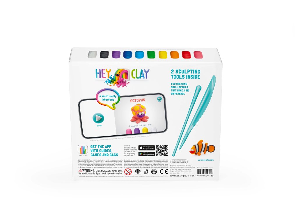 Z modelovací hmoty HEY CLAY si děti mohou vytvořit nepřeberné množství různých postaviček, zvířátek nebo oblíbených hrdinů. Po vymodelování je důležité nechat modely na vzduchu dostatečně zatvrdnout a tím okamžikem se mohou stát součástí dalších her a zábavy. Lze si tak jednoduše vytvořit vlastní figurky a postavičky, nebo schovat Hay Clay opět do kelímku pro další tvorbu. S mobilní aplikací Hey Clay (iOS, Android), kterou si zdarma stáhnete, a která nabídne dětem další možnosti rozvíjení fantazie, barev a kouzlení s vytvářením nových postaviček – kód v hodnotě 5USD pro otevření aplikace, najdete v každém baleníSada Hey Clay obsahuje 2 plastové sochařské nástroje a 15 nádobek s měkkou, jemnou a voňavou modelínou a přístupový kód do aplikace pro zakoupenou řadu. Barvy nacházející se v balení Vám umožní vytvořit 6 postaviček.