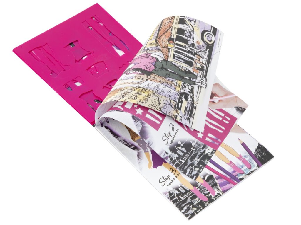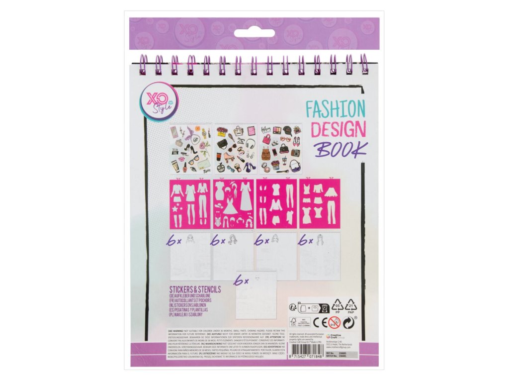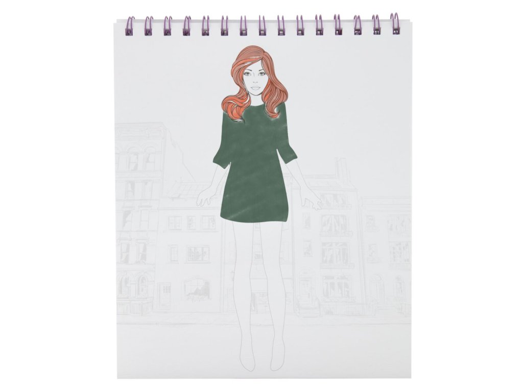 Kreativní set ve formě kroužkového bloku s motivem designu a módního návrhářství obsahuje 36 listů předloh, které je možné vymalovat s pomocí 5 listů šablon a doplnit pomocí přiložených samolepek