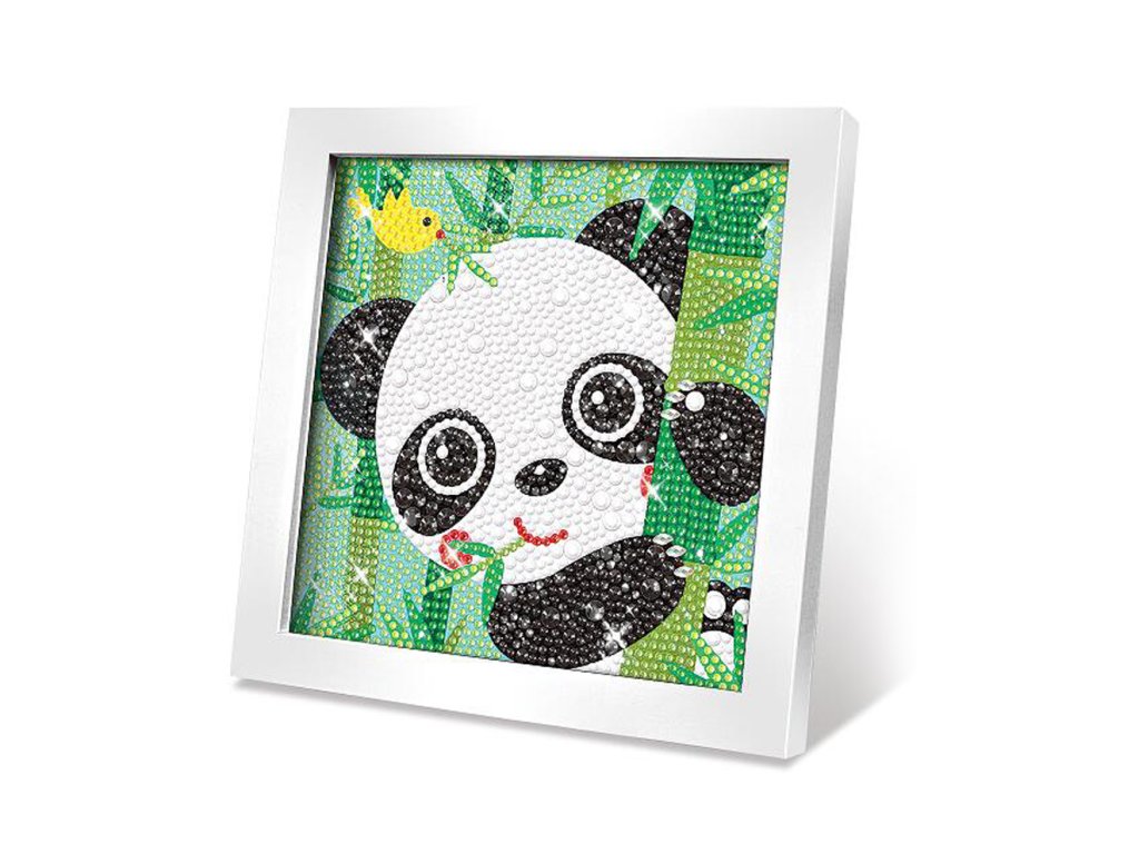 Kreativní set obraz s kamínky panda. Velikost 17,5x17,5x1,5cm. Obsahuje misku na kamínky, pero na nabírání a umísťování kamínků, kamínky různých barev, vosk, rámeček. Postup: z obrázku sloupněte folii, špičku přiloženého pera přiložte na vosk, perem naberte kamínek, umístěte ho na obraz.