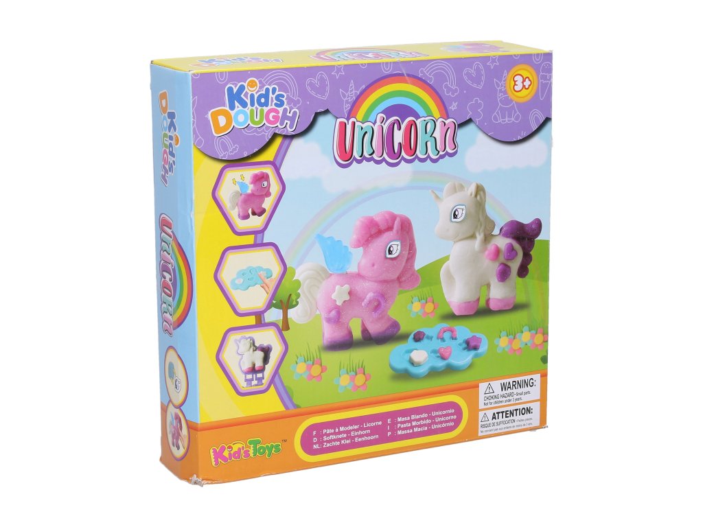 Modelína jednorožec. Balení obsahuje 3 barvy modelíny, formy na jednorožce, křídla a ozdoby na jednorožce, nůžky, špachtle.