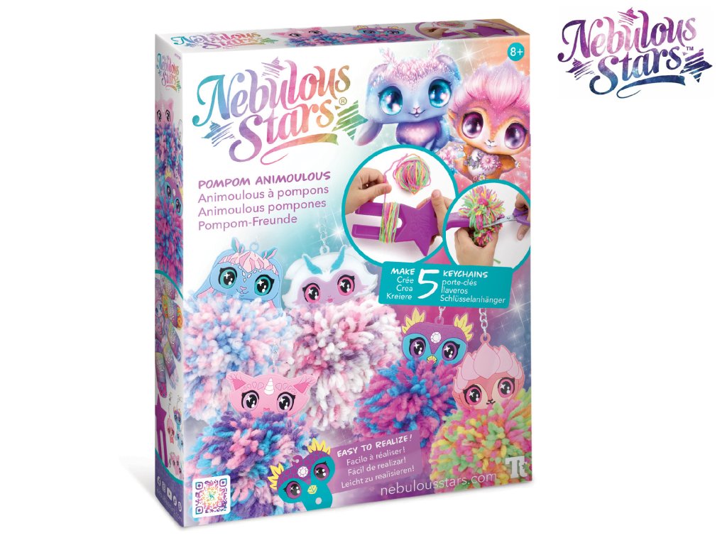 Nebulous Stars Bambulka animouš. Obsahuje 5 držáků na bambulky s animoušem, 5 barev akrylové příze, 1 nástroj na výrobu bambulek, příběh zvířátek, barevné pokyny.