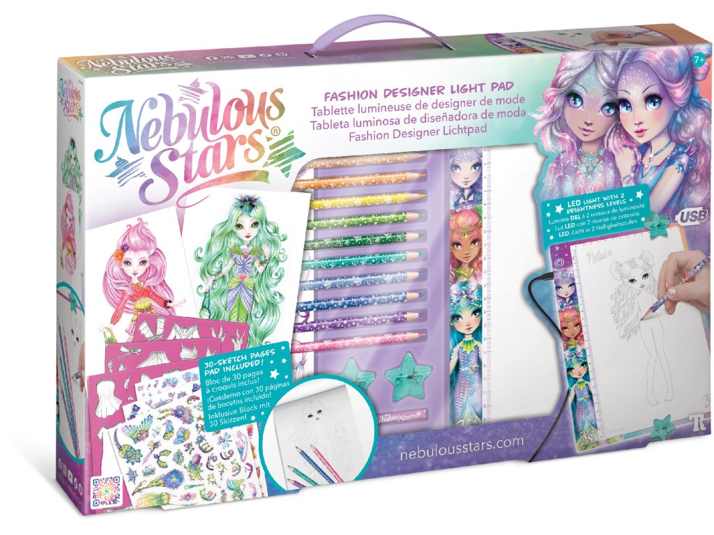 Nebulous Stars Návrhářská podsvícená tabulka. Plocha tabulky 14x25 cm. 2 úrovně jasu. Obsah - podsvícená tabulka, usb kabel, 11 pastelek, 30 šablon, 2 klipy.