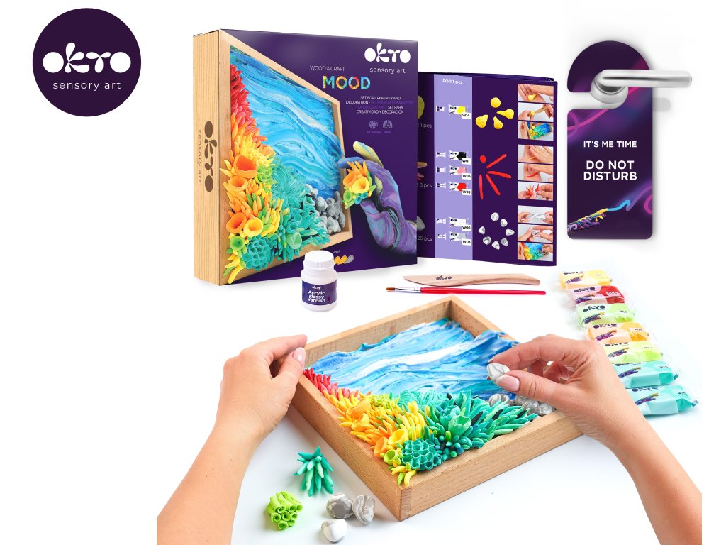 OKTO 3D Obraz modelovací set motiv "Klidný oceán". Rozměry dřevěného rámu 21x21x5 cm. Vytvarujte 3D obraz podle návodu. Obtížnost 4/5. Obsah balení - rám, obrázkový návod, dřevěné modelovací nástroje, sada modelovací hmoty, akrylový lak 20ml, štětec.