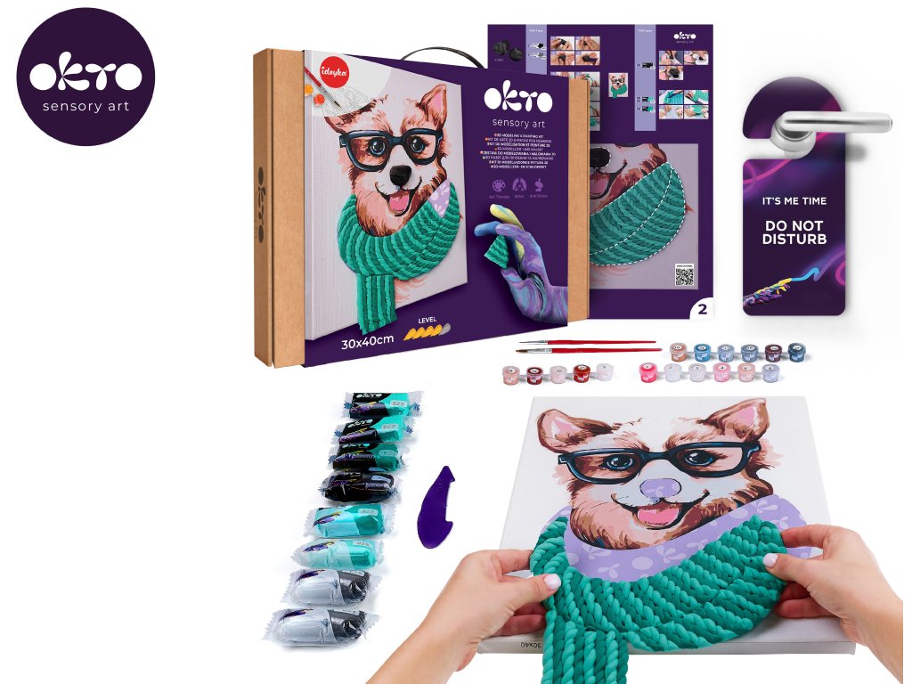 OKTO Malba a 3D modelování obraz "Fashion Corgi". Velikost plátna 30x40 cm. Vymalujte obrázek podle čísel a vytvarujte 3D prvek obrazu. Obsah balení - plátno, obrázkový návod, modelovací nástroj, Sada samoschnoucí modelovací hmoty, set barev na malování, štětec.