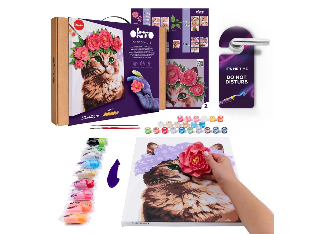 OKTO Malba a 3D modelování obraz "Kočka s květinovou korunkou". Velikost plátna 30x40 cm. Obsah balení - plátno, obrázkový návod, modelovací nástroj, Sada samoschnoucí modelovací hmoty, set barev na malování, štětec. Obtížnost 4/5.