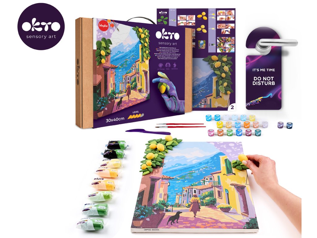 OKTO Malba a 3D modelování obraz "Lemon Weekend". Velikost plátna 30x40 cm. Vymalujte obrázek podle čísel a vytvarujte 3D prvek obrazu. Obsah balení - plátno, obrázkový návod, modelovací nástroj, Sada samoschnoucí modelovací hmoty, set barev na malování, štětec.