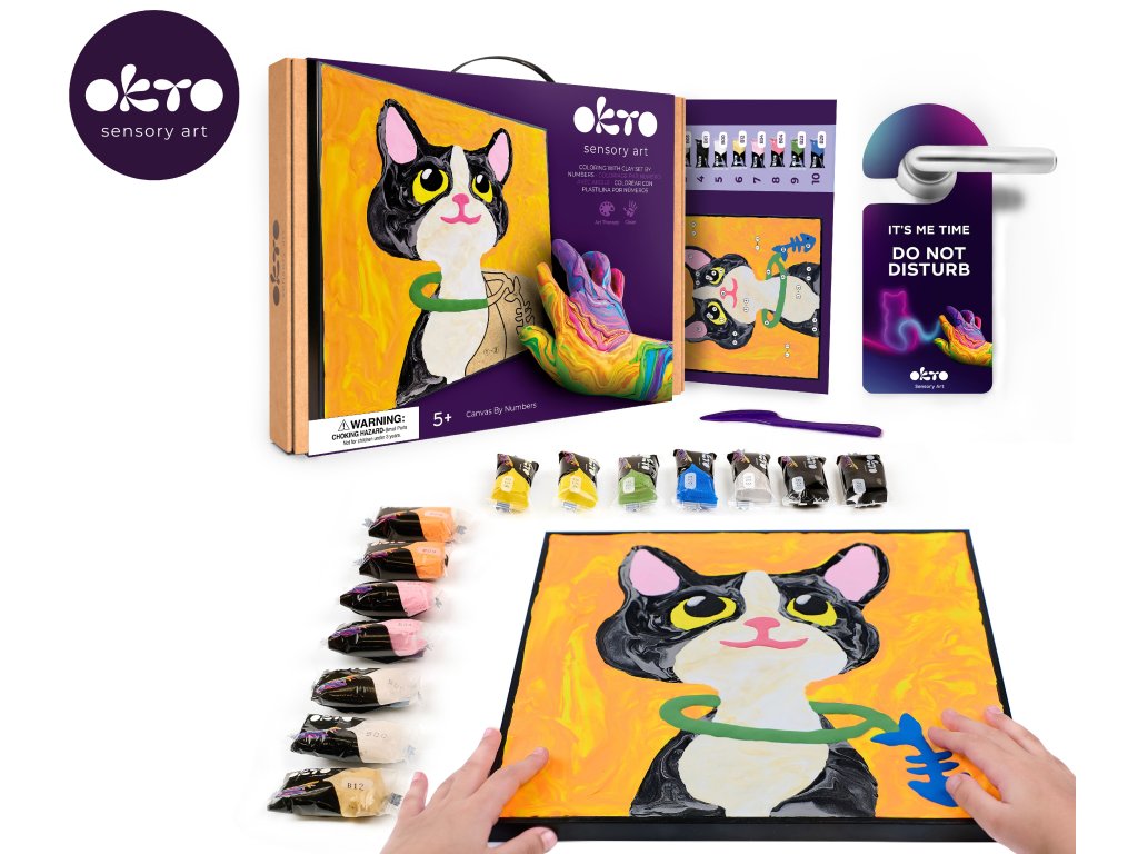 OKTO Malování hmotou podle čísel "Kočka". Velikost plátna 29x29 cm. Vytvarujte obrázek podle čísel. Obsah balení - rám, plátno, obrázkový návod, modelovací nástroj, sada barevných tvarovacích směsí 14 ks.