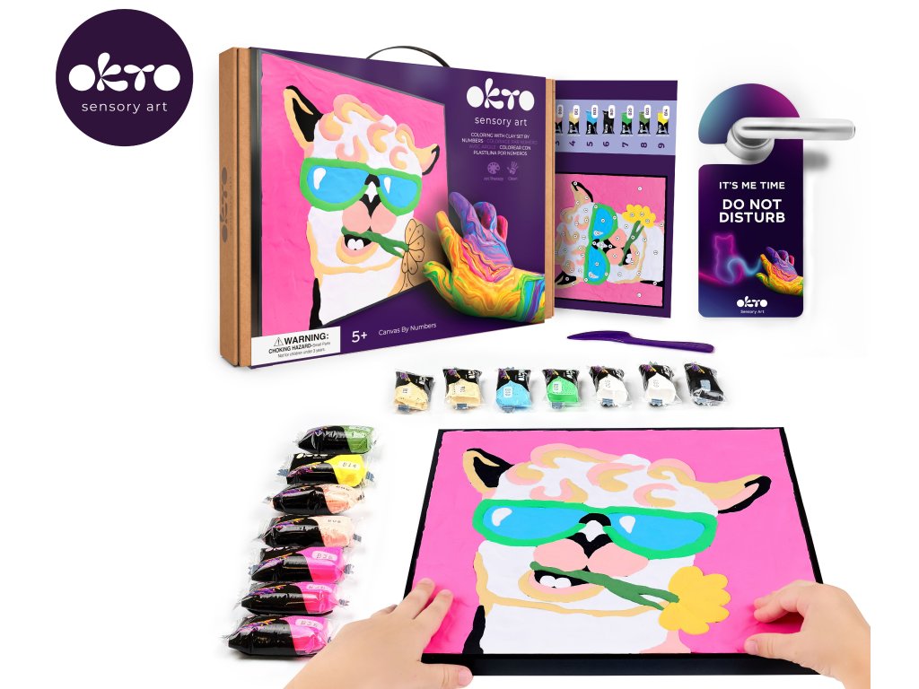 OKTO Malování hmotou podle čísel "Lama". Velikost plátna 29x29 cm. Obsah balení - plátno, obrázkový návod, modelovací nástroj, sada barevých tvarovacích směsí 14 ks.