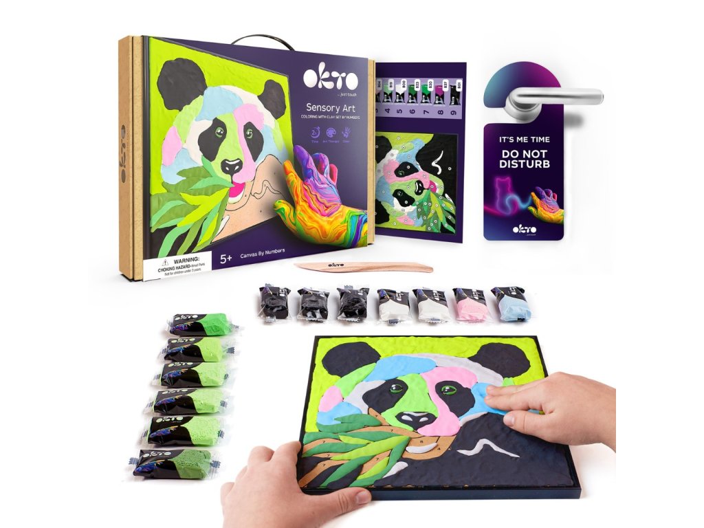 OKTO Panda výtvarná sada malování na plátno 30x30 cm. Velikost plátna 30x30cm. Přírodní plátno, návod, dřevěný tvarovací nástroj, 40ks modelovací hmoty.