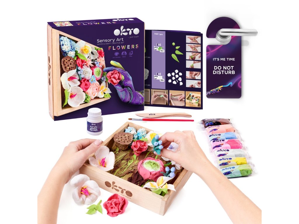 OKTO ROMANCE Výtvarná modelovací sada DIY květiny s dřevěným rámem. Velikost rámu 21x21 cm. Obsah balení - přírodní plátno, návod, dřevěný tvarovací nástroj, 40 ks modelovací hmoty.