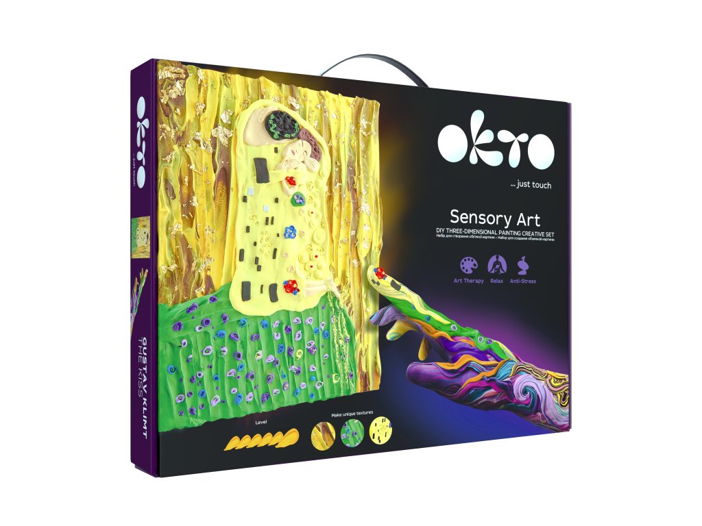 OKTO SENSOTY ART výtvarná sada ”Polibek” Velikost plátna 30x40cm. Obsah balení: přírodní plátno, návod, dřevěný tvarovací nástroj, sada modelovacích hmot, akrylový (vodou ředitelný) lak 20 ml, štětec.