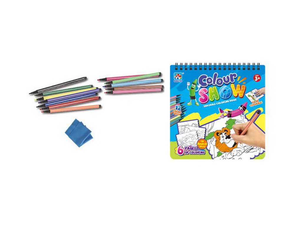 Omalovánky, stíratelné, 6 obrázků. Rozměry 17x17 cm. Balení obsahuje 12 fixů a hadřík.