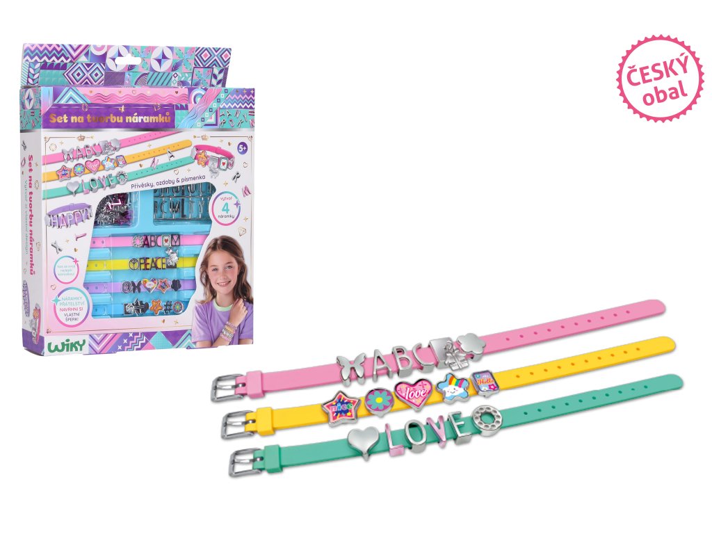 Tvorba náramků s písmeny. Obsahuje 4 náramky s nastavitelnou velikostí, písmenka, přívěšky.