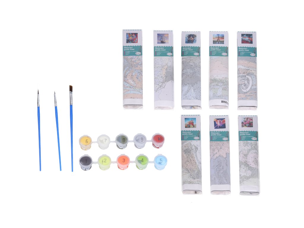 Uvnitř balení: 1x plátno, 1x sada barev, 3x štětec, návod.