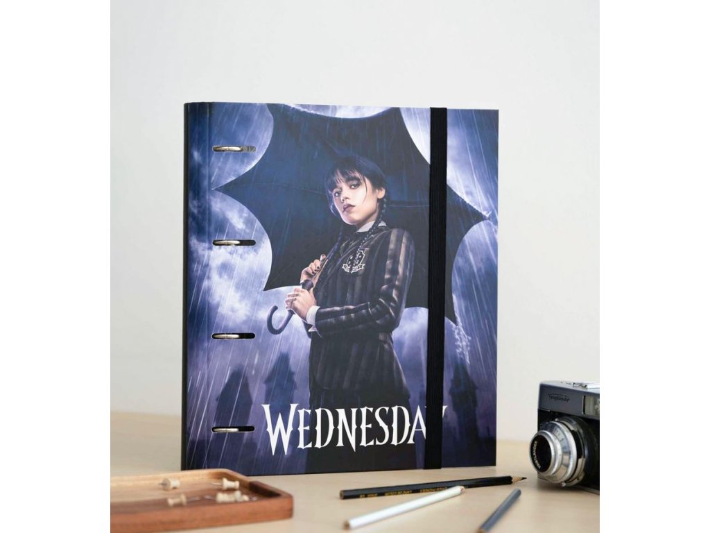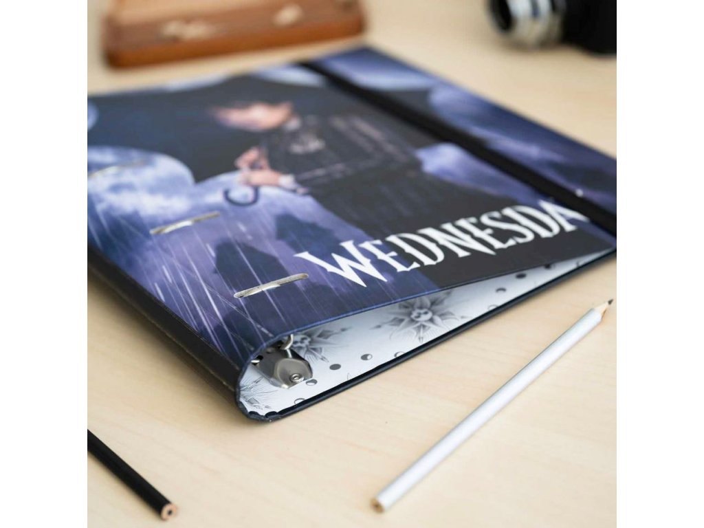Oficiální produkt - kroužkový pořadač z katalogu zboží s licencí a grafikou amerického seriálu Wednesday od společnosti Netflix.