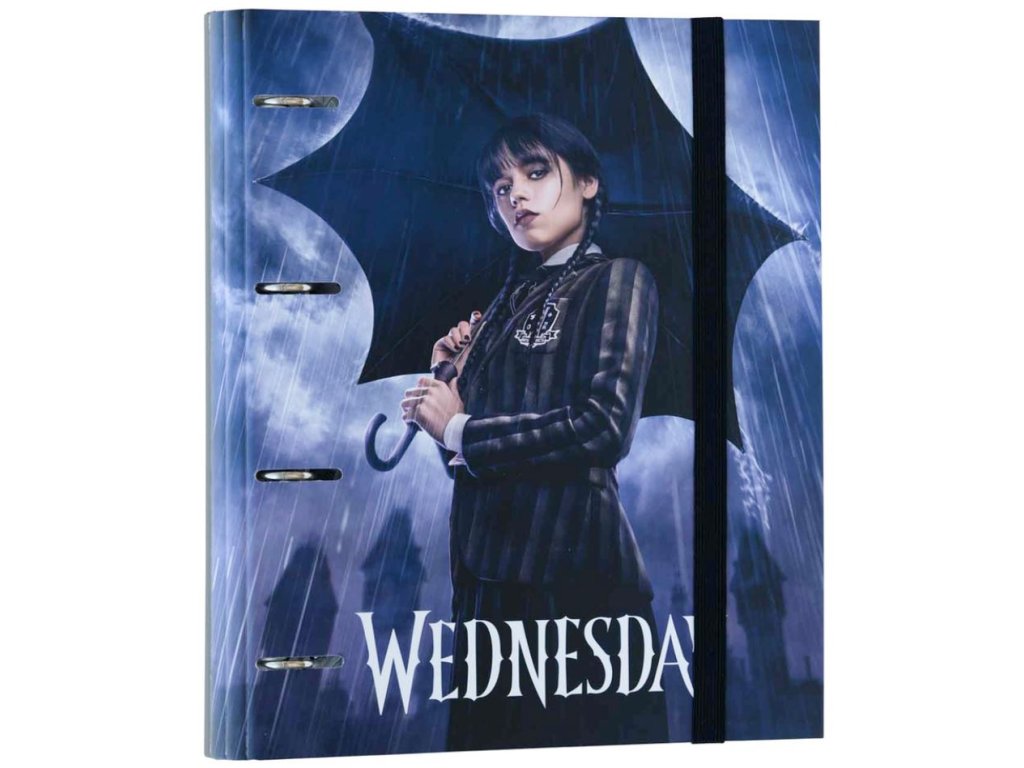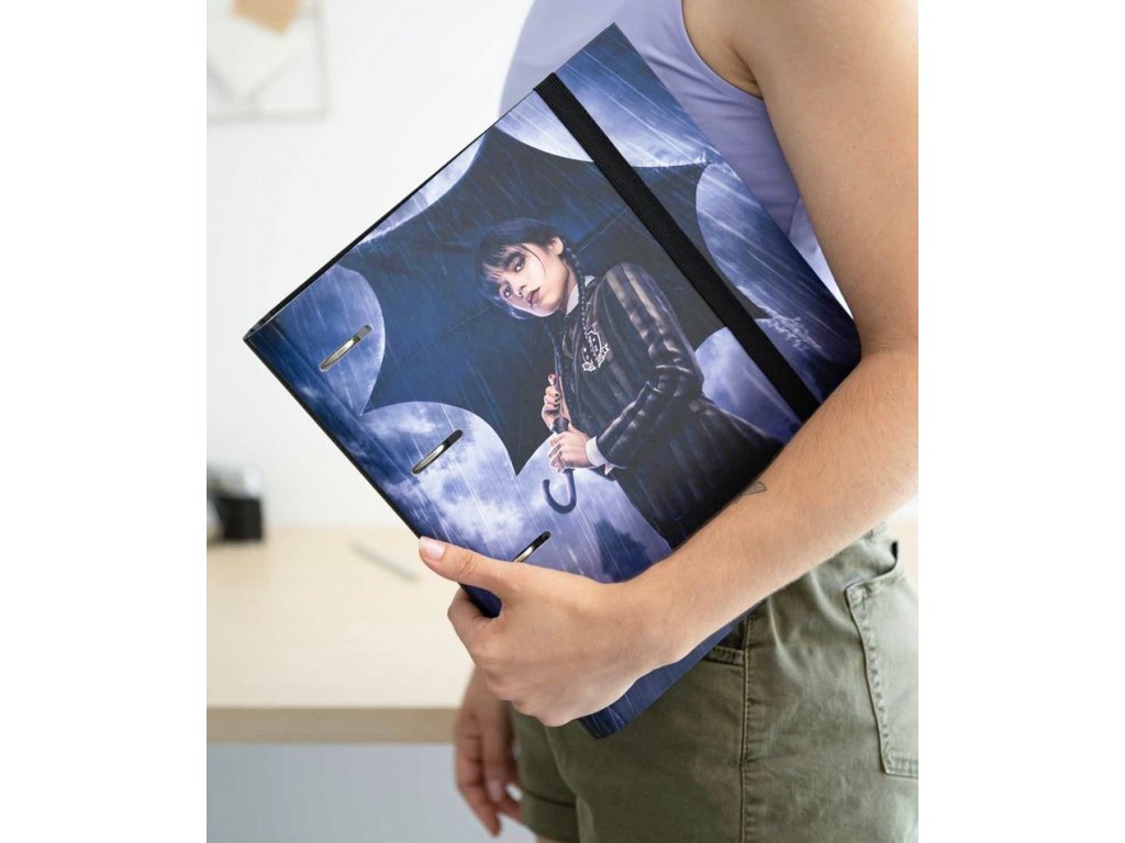 4 kroužkový pořadač vyvedený v motivu postavy Wednesday s ikonickým černým deštníkem. Pořadač má stahovací pásek, který slouží proti nechtěnému otevření. Pořadač je vhodný pro každého menšího i většího fanouška, který chce mít své věci hezky uložené a chráněné díky Wednesday Addamsové.