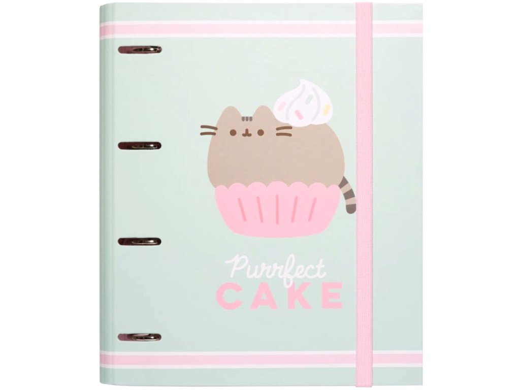 4 kroužkový pořadač inspirovaný kočkou Pusheen. Pořadač má stahovací pásek, který slouží proti nechtěnému otevření.