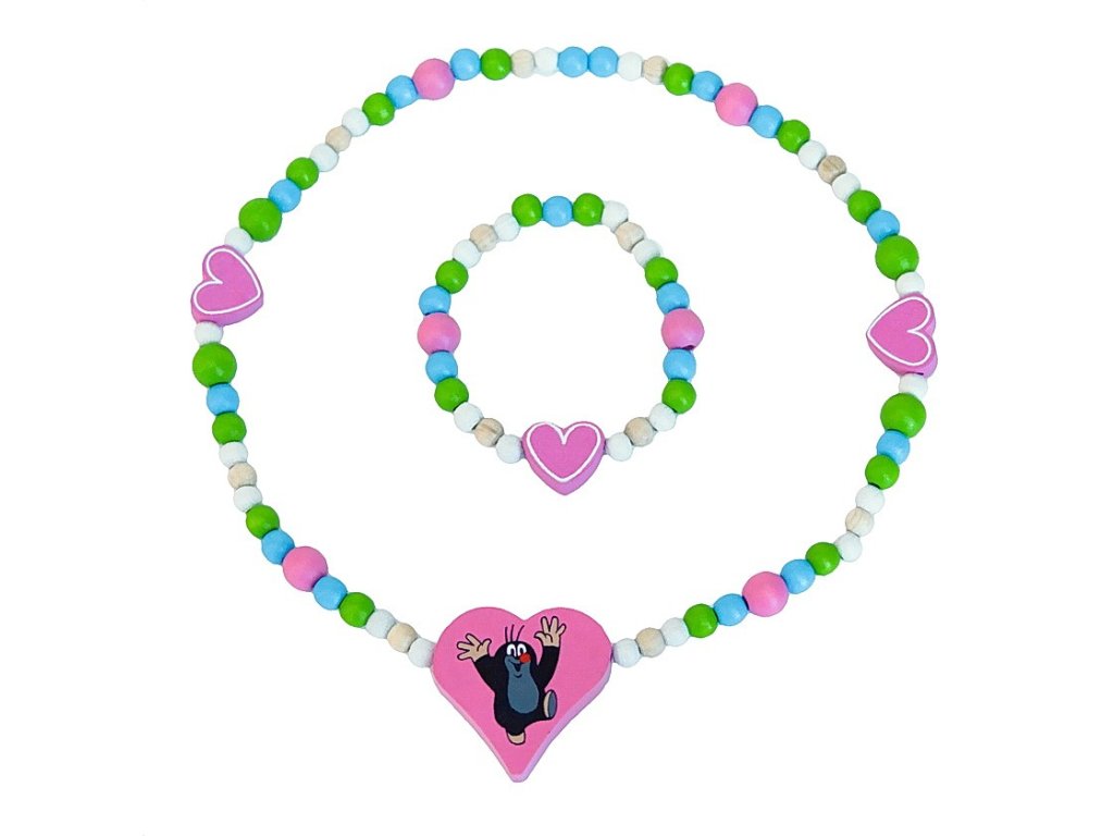 Dřevěná bižuterie se srdíčky a krtečkem. Navlečeno na jemné gumičce. Nevhodné pro děti do 3 let. Obsahuje malé části. Výrobek je zdravotně nezávadný.