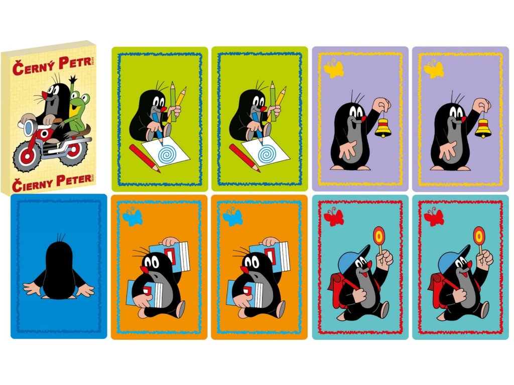 Dětské karty pro hru zvanou Černý Petr s obrázky Krtka od ilustrátora Zdeňka Milera. Krabička obsahuje i podrobný návod a karty mají na rubové straně mírně zdrsnělý povrch pro lepší manipulaci s nimi.