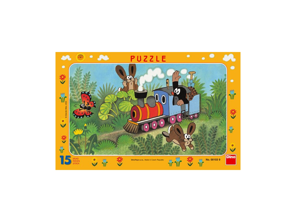 Deskové puzzle s motivem Krtečka v lokomotivě obsahující 15 dílků. Velikost složeného obrázku je 25 x 14,5 cm. Vhodné pro děti od 3 let.