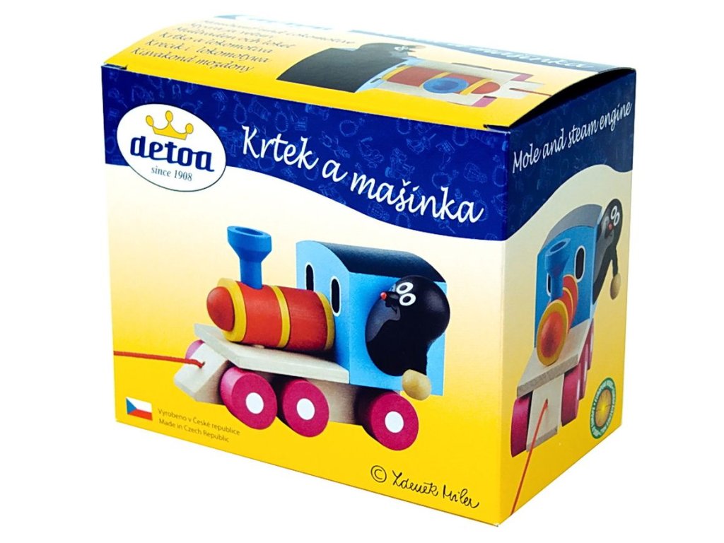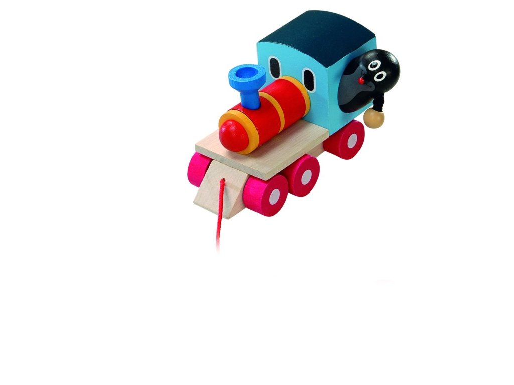 Tahací dřevěná mašinka s krtečkem jako strojvedoucím. Nevhodné pro děti do 3 let. Obsahuje malé části. Výrobek je zdravotně nezávadný.