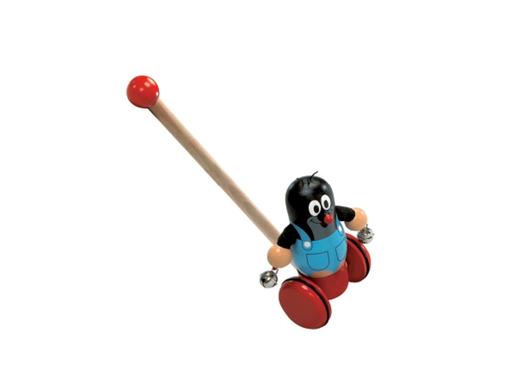 Dětské strkadlo s pohádkovým krtečkem. Krteček se při pohybu kolébá a cinká rolničkami.