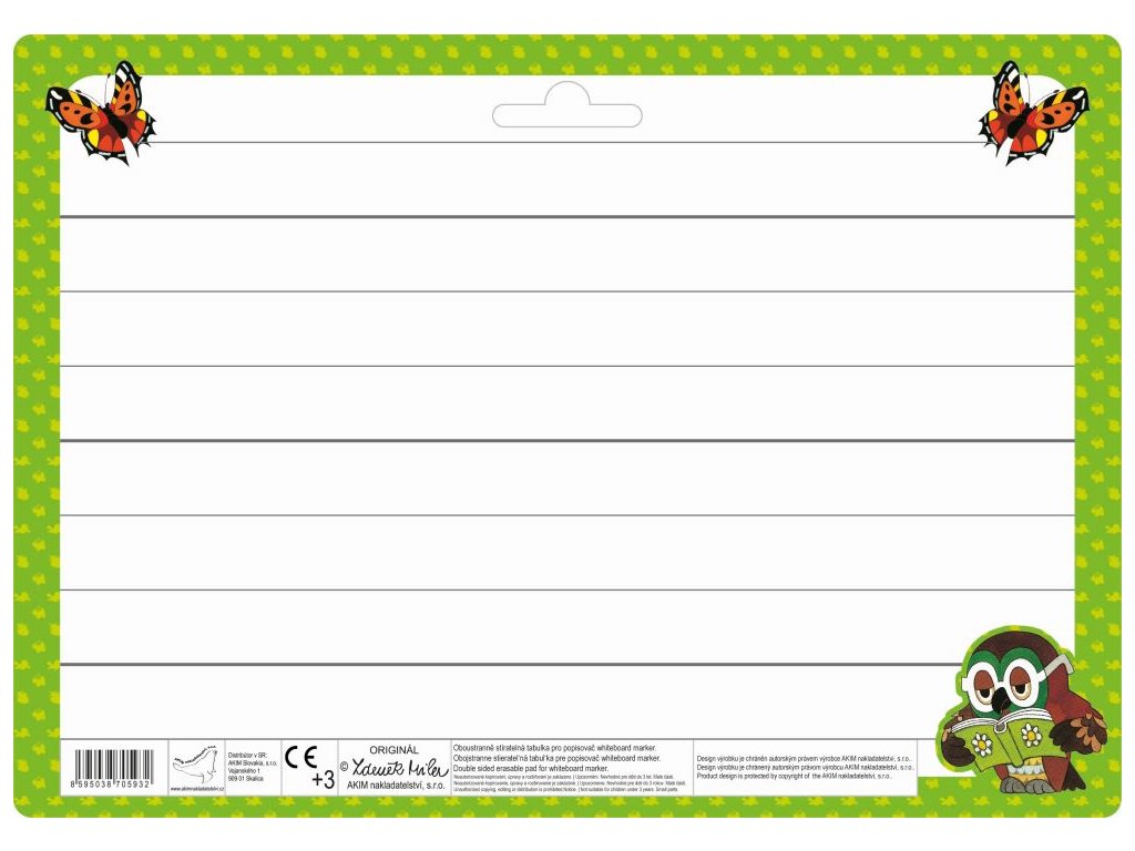 materiál pevný silný karton, lesklý povrch z rubové i lícové strany, součástí výrobku 2 stíratelné popisovače modré a černé barvy, slouží k opakovanému nácviku psaní i kreslení, tabulka vytvořena na základě doporučení poradny pedagogů