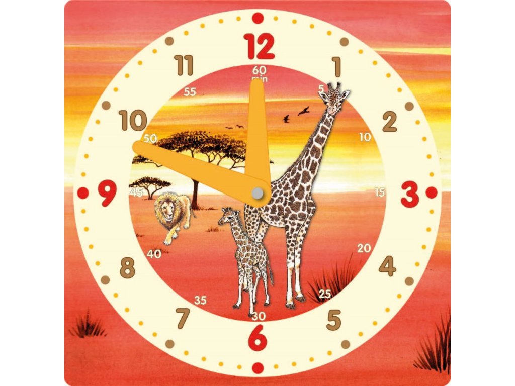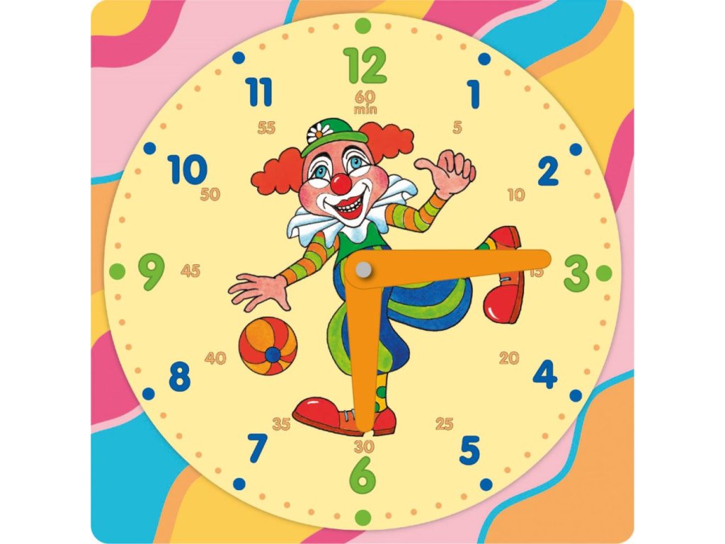 12ti hodinový čas+ minuty, materiál pevný karton s lesklou povrchovou úpravou, barevné ručičky, nýty vkládány strojově-nelze ručně rozpojit,