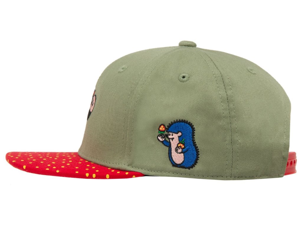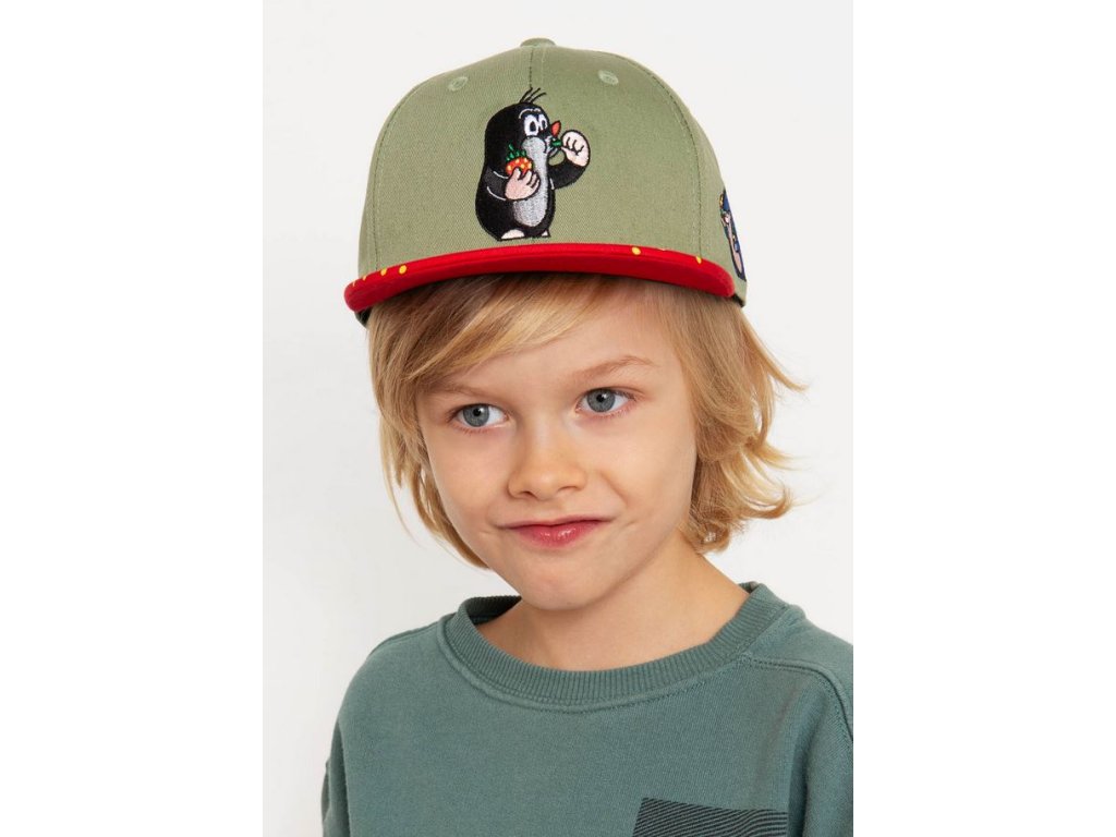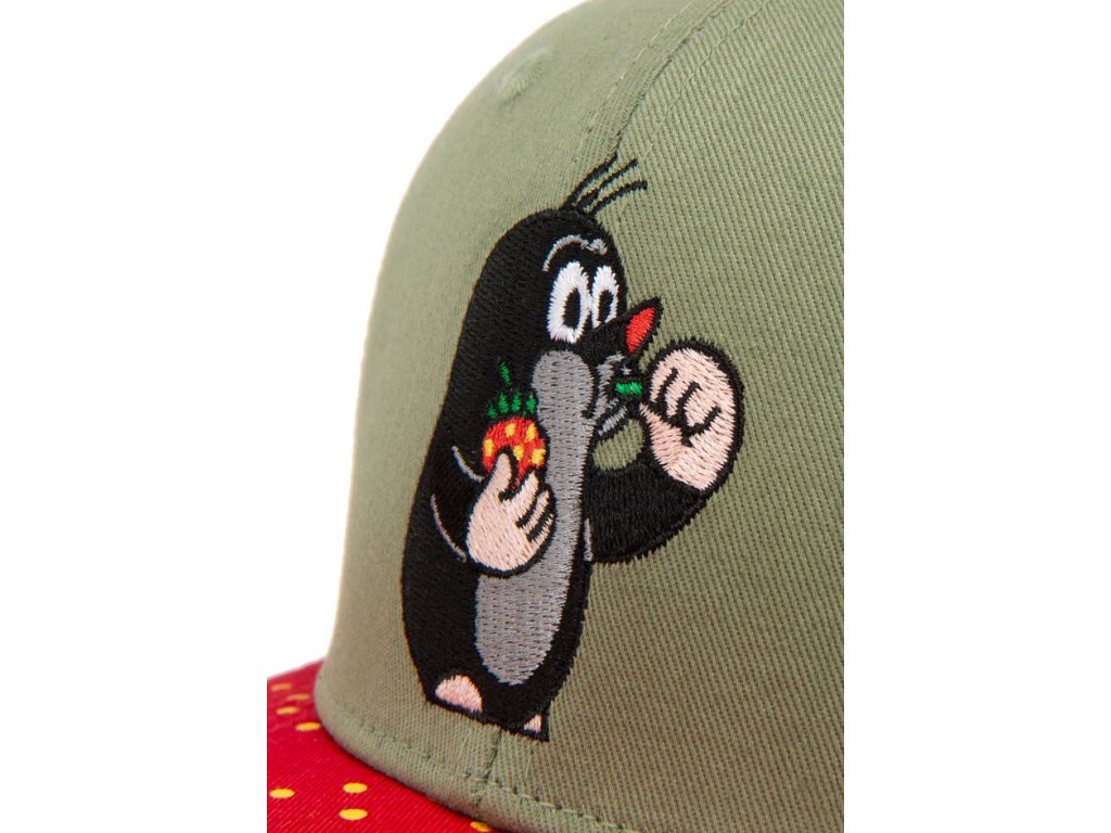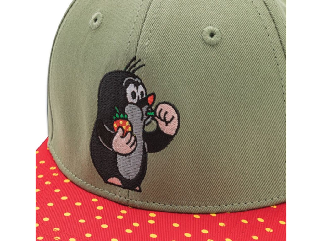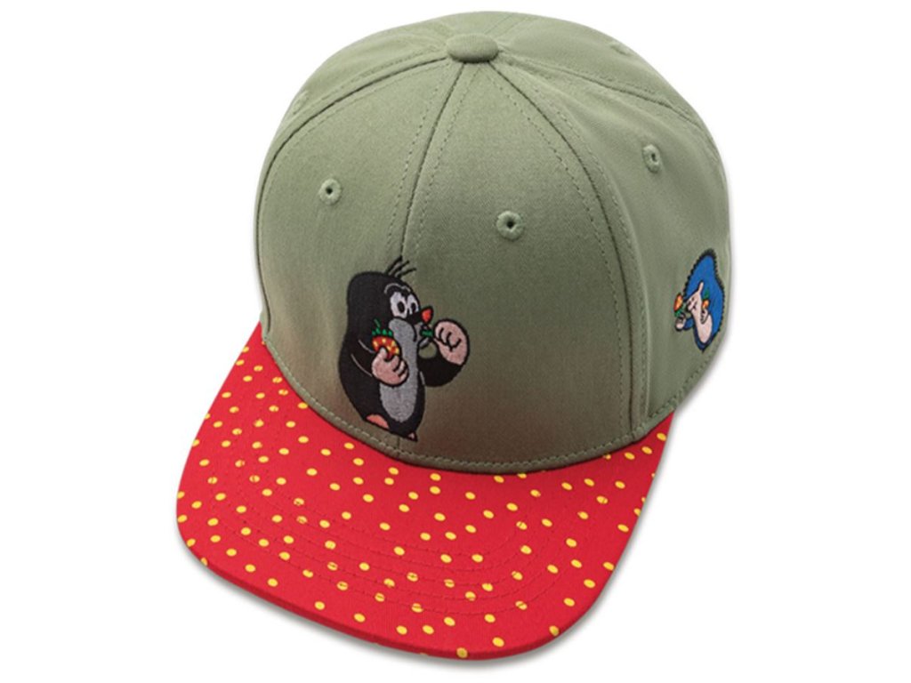Atraktivní dětská zelená kšiltovka s rovným červeným kšiltem se žlutými puntíky. Nad kšiltem je vyšitá postavička Krtečka pochutnávajícího na jahodě. Z boku kšiltovky je vyšitý Krtkův kamarád Ježek s jahůdkami v ruce. Nastavitelná velikost polohovacím řemínkem v zátylku.